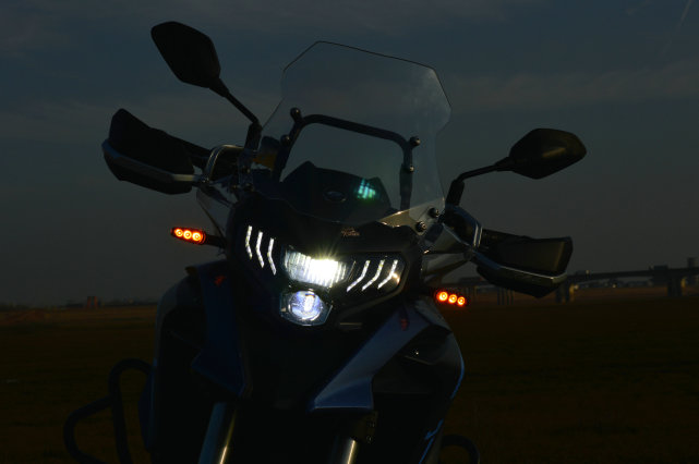 ADV標準的“鳥嘴”與車身包圍接合嚴絲合縫,車頭部分采用類似空氣力學設計的導風槽,看上去頗為運動,原廠配備的風擋是固定的形式,在大風擋兩側還有兩塊小風擋,檔風效果很不錯,但終究無法調節(jié),這一點有些遺憾。