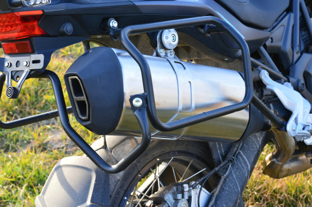 高位排氣是硬派拉力摩托必備的另一個要素,目的在于提高涉水性能,原廠預留的邊箱支架已經做了讓位處理。