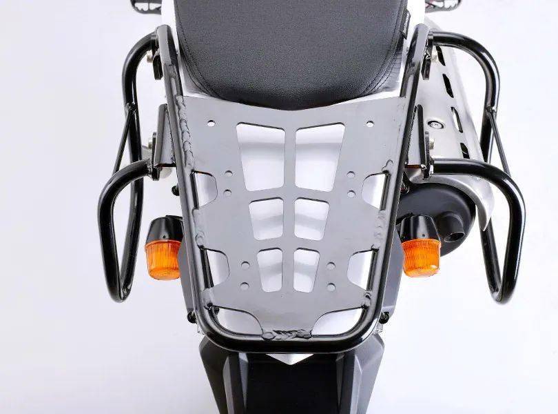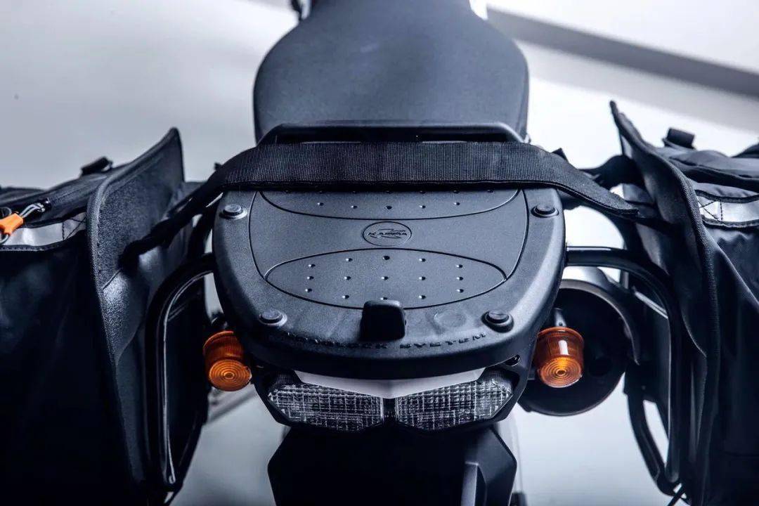 在車輛的尾部,可配備一體成型的尾箱 + 兩側(cè)邊袋支架,該支架的各個安裝支點,對應他們 DF 公司所銷售的尾箱和邊袋。此舉可大幅提升車輛的裝載能力。對應可能存在的、額外的行李裝載,DF 公司為后懸掛系統(tǒng)提供一套降低車輛高度(降低了 31 mm)的聯(lián)接連桿套件,以及對應的后減震加硬彈簧,并可根據(jù)客戶的需要,配用更低的短型鋁制鍛造連桿套件。