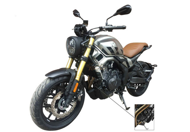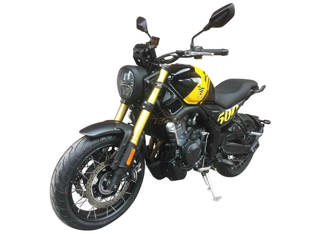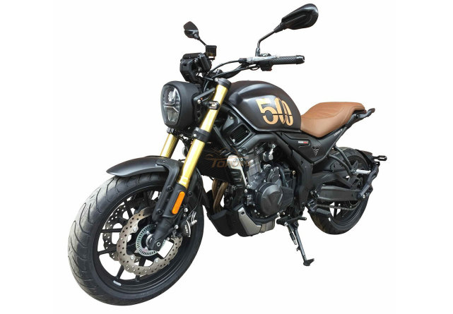 最簡單的配色方案,黑色為主基調(diào),油箱兩側(cè)僅有兩個500的字樣,金色倒立式前叉和棕色皮革座椅彰顯檔次,配備鋁合金鑄造輪圈。