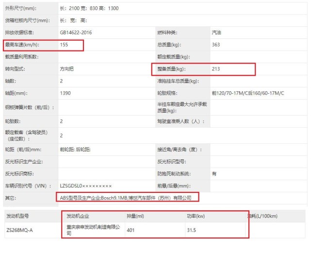 申報(bào)數(shù)據(jù)當(dāng)中顯示,整備重量149kg,而之前公開的是干重147kg,整備重量150kg,另外申報(bào)數(shù)據(jù)當(dāng)中的最大功率為29kw,之前公布的數(shù)據(jù)為30.5kw。該車配備的ABS是由賽福提供,廠家給出的極速數(shù)據(jù)為170km/h。