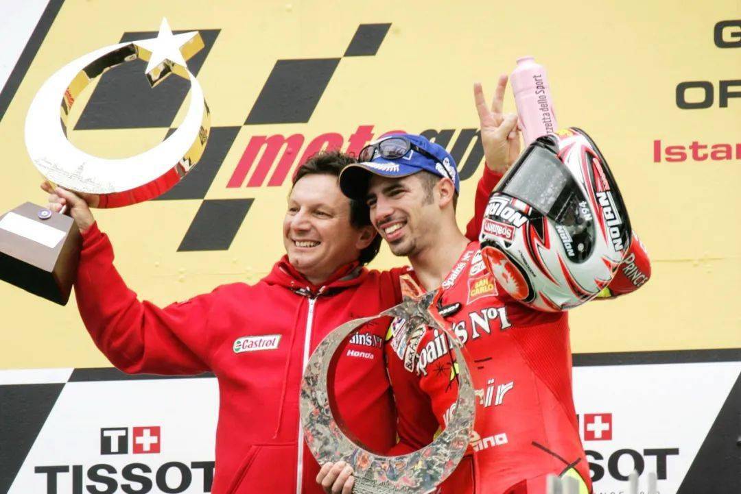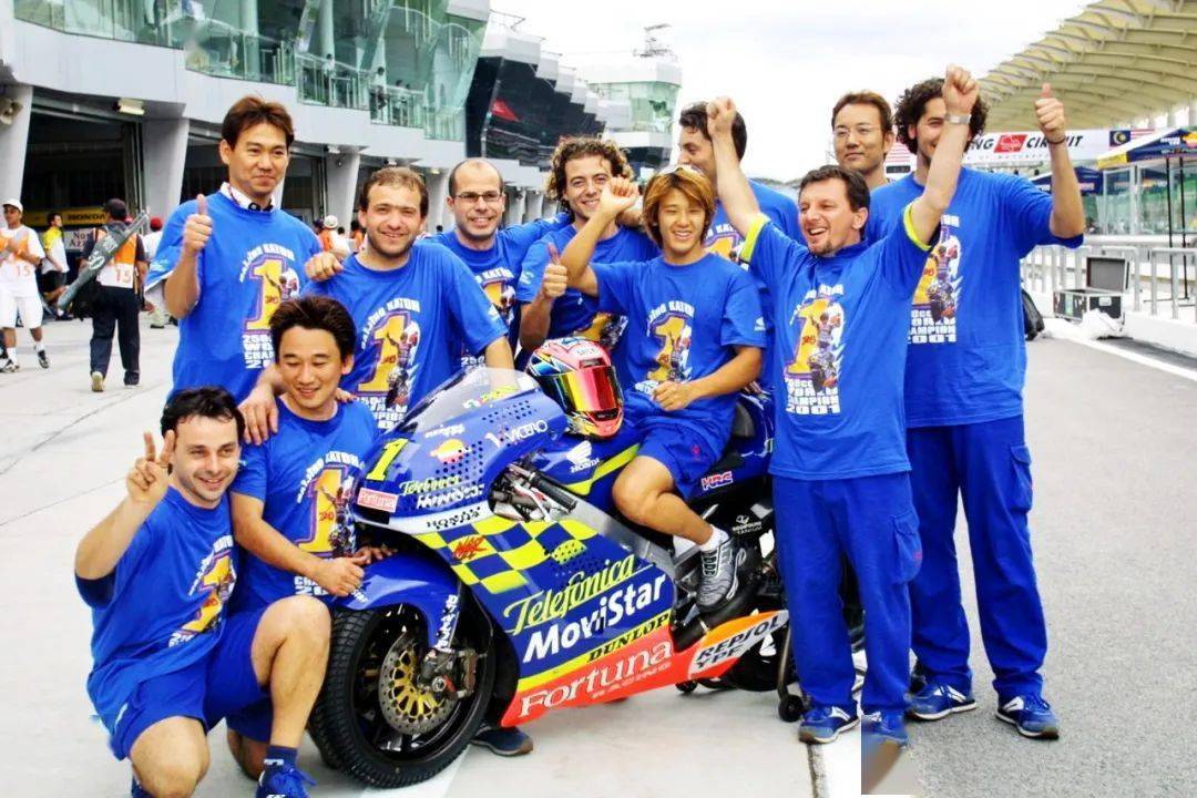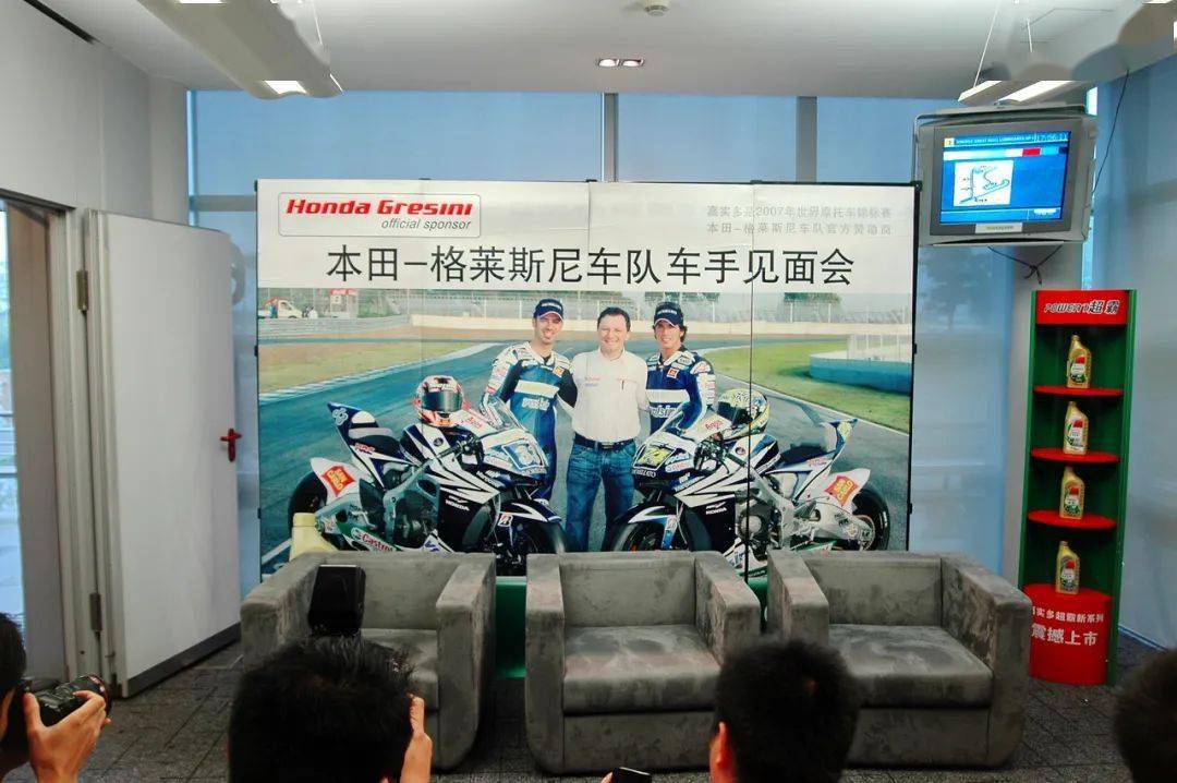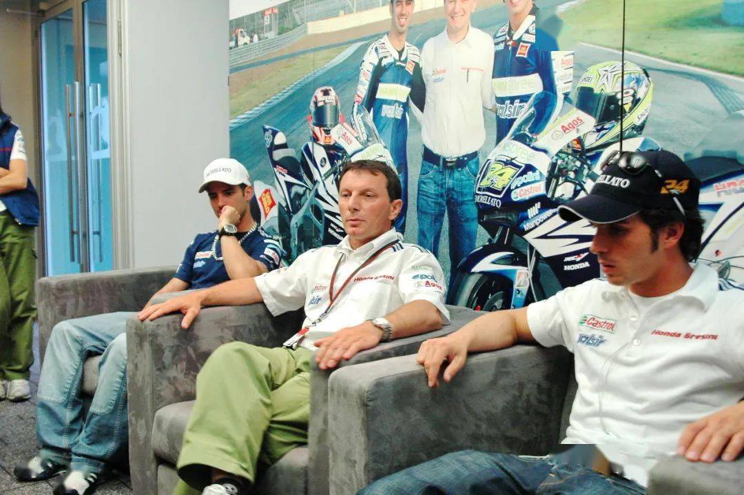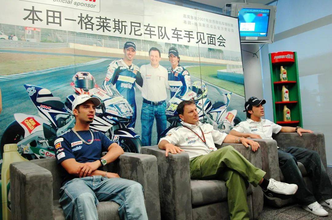 下面的圖片,2007' MotoGP 上海站,作為 Honda 衛(wèi)星車隊的 Honda Gresini 吉斯尼車隊,福斯托.吉斯尼攜當(dāng)時的兩位車手米蘭迪(Marco Melandri)和艾利亞斯(Toni Elias),出席在中國媒體見面會上。