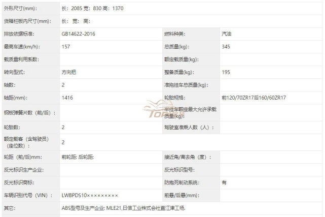 除了發(fā)動機信息之外,被公布的其他申報消息如下圖,標準版的整備重量為195kg,三箱版的整備重量為215kg,ABS由日信提供,車輪尺寸前120-70/17,后輪尺寸160-60/17。