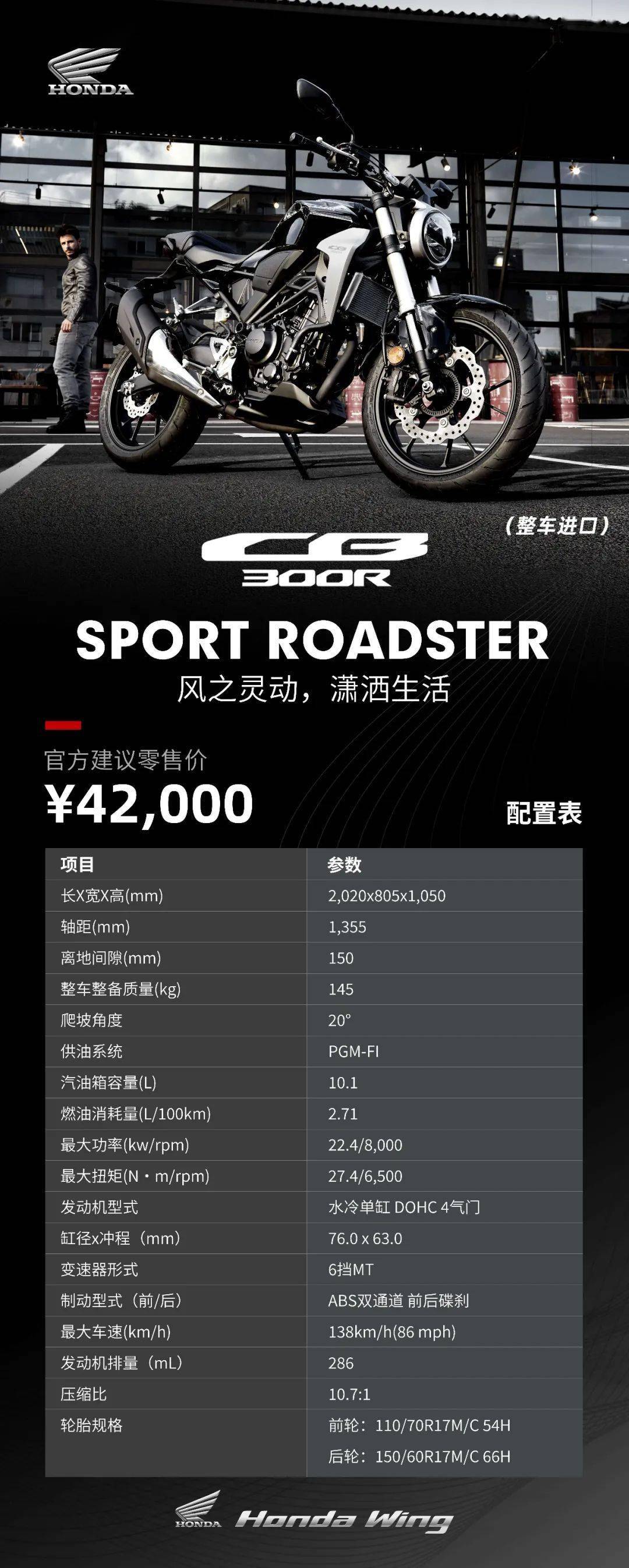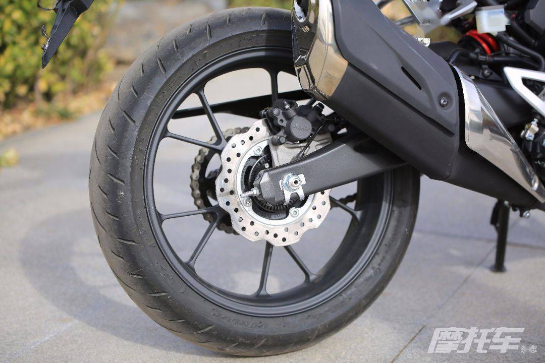 車架方面,CB300R配上了鉆石型鋼管車架,輕盈堅(jiān)固。CB300R裝備了SHOWA 41mm倒立式前叉,行程129.5mm;后部匹配的是預(yù)載可調(diào)Pro-link單筒減震器,行程106.7mm,為騎手創(chuàng)造激情且舒適的旅途。制動(dòng)系統(tǒng)同樣作了升級(jí),前輪安裝了296mm浮動(dòng)式單盤(pán),匹配的是NISSIN輻射式4活塞卡鉗,后輪則由φ220mm的單制動(dòng)盤(pán)+NISSIN單活塞卡鉗司管。輪胎為鄧祿普SPORTMAX系列,前輪尺寸110/70 R17,后輪尺寸150/60 R17。標(biāo)配的ABS系統(tǒng)讓騎手的制動(dòng)過(guò)程更平穩(wěn)、更安全!同時(shí)許多人并不知道的是,CB300R還配備了2軸的IMU慣性測(cè)量單元,并與制動(dòng)系統(tǒng)關(guān)聯(lián),能夠更好的控制車輛在加速、制動(dòng)時(shí)的前后姿態(tài)。