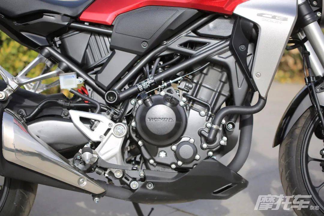 CB300R搭載了液冷、DOHC 4氣門的單缸發(fā)動(dòng)機(jī),實(shí)際排量286mL,壓縮比10.7:1。這顆動(dòng)力心臟采用了先進(jìn)技術(shù),由PGM-FI 電子燃油噴射系統(tǒng)伺服,而且內(nèi)置怠速空氣控制閥,能夠減速時(shí)降低回轉(zhuǎn)扭矩,并在騎手轉(zhuǎn)動(dòng)油門優(yōu)化動(dòng)力變化的連續(xù)性。同時(shí),單缸發(fā)動(dòng)機(jī)的曲軸配置了特種鏈條哈瓦鏈,由分叉式滾子搖臂驅(qū)動(dòng),這樣無(wú)需移動(dòng)凸輪即可調(diào)節(jié)氣門墊片,方便維護(hù);氣門間隙調(diào)節(jié)周期延至2.5萬(wàn)千米一次,讓騎手省心省事。最大功率22.4kW(8000r/min),最大扭矩27.4N·m(6500r/min),動(dòng)力爆發(fā)更早,同時(shí)性能表現(xiàn)也比CM300或是CBR300R更加強(qiáng)勁。