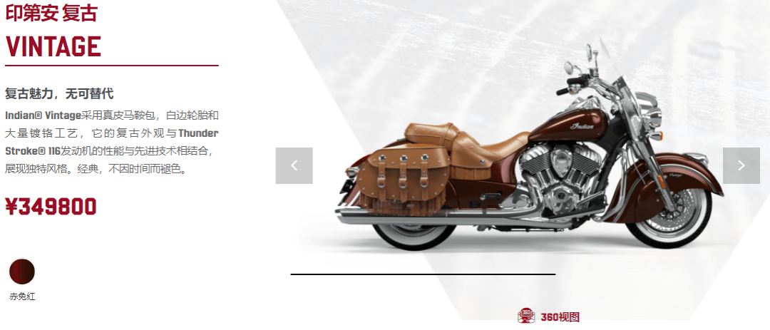 Vintage系列有著經(jīng)典的外觀設(shè)計,配以現(xiàn)代精湛工藝,演繹復(fù)古美式摩托風(fēng)格。永不過時的真皮、鉚釘、流蘇等元素的大量運(yùn)用,讓騎士彰顯其卓爾不群的風(fēng)范。印第安中國引入Vintage Dark Horse(復(fù)古黑馬)與Vintage(復(fù)古)兩款車型。Vintage的鍍鉻工藝、白邊輪胎、流蘇邊包等部件彰顯了印第安的標(biāo)志性傳統(tǒng)。而Vintage Dark Horse也應(yīng)用了黑色皮革和車體完全涂黑的款式。至暗桀驁或經(jīng)典奪目,在道路上絕不被忽視。