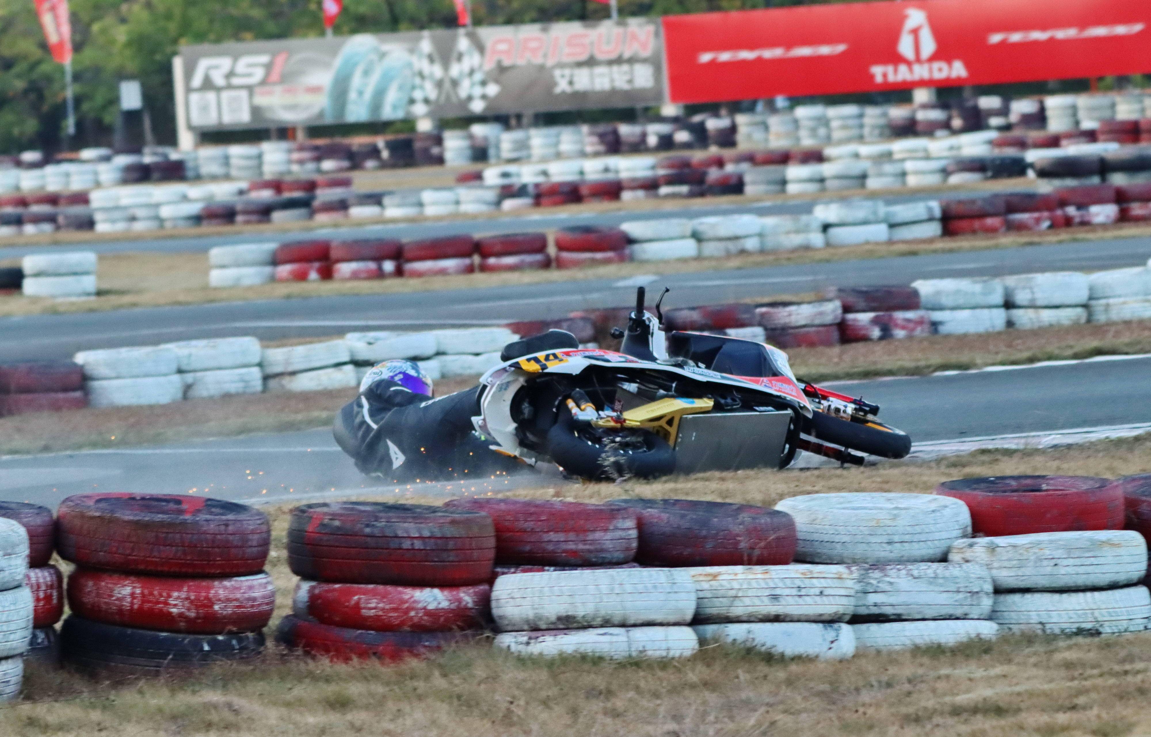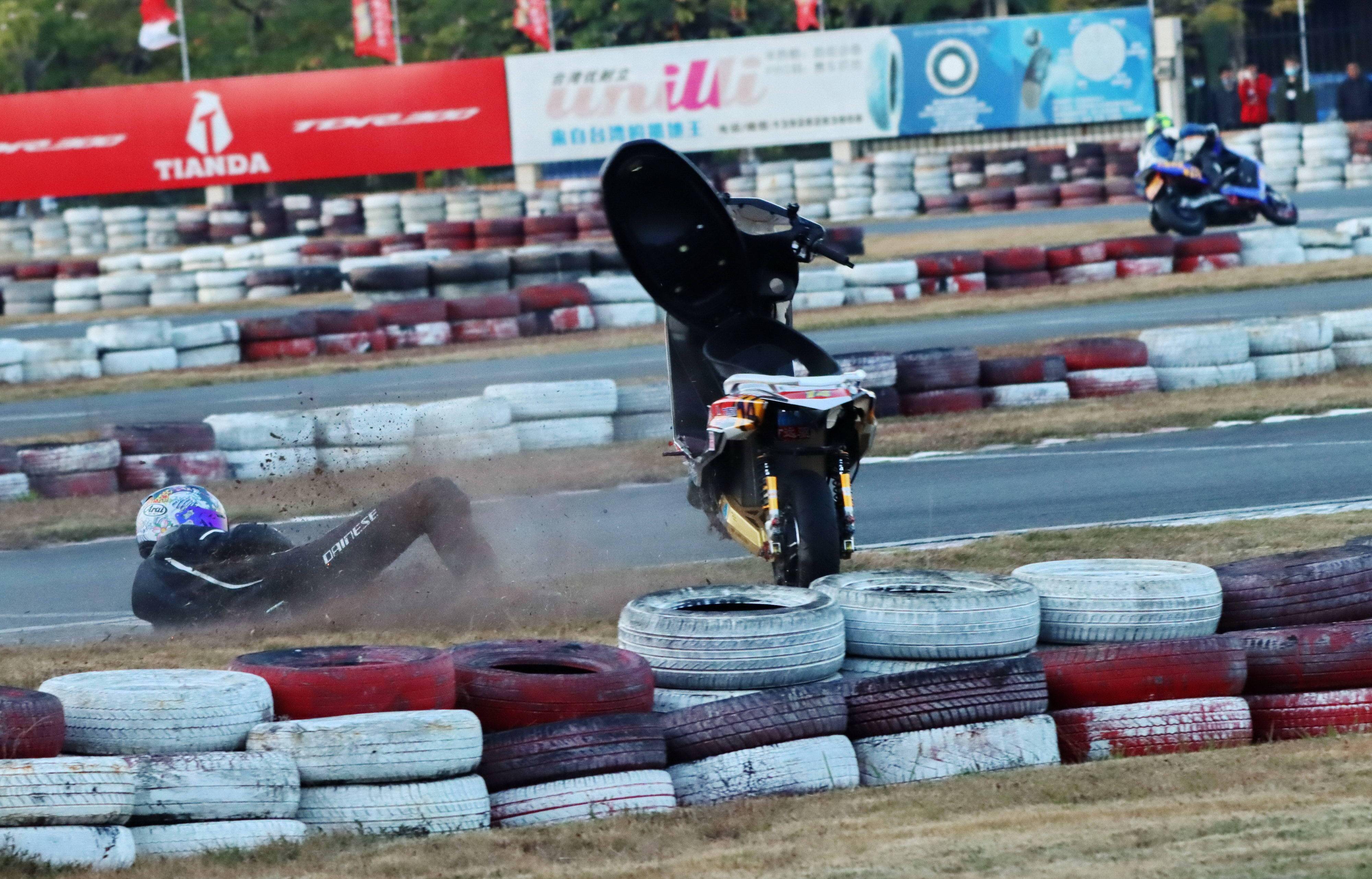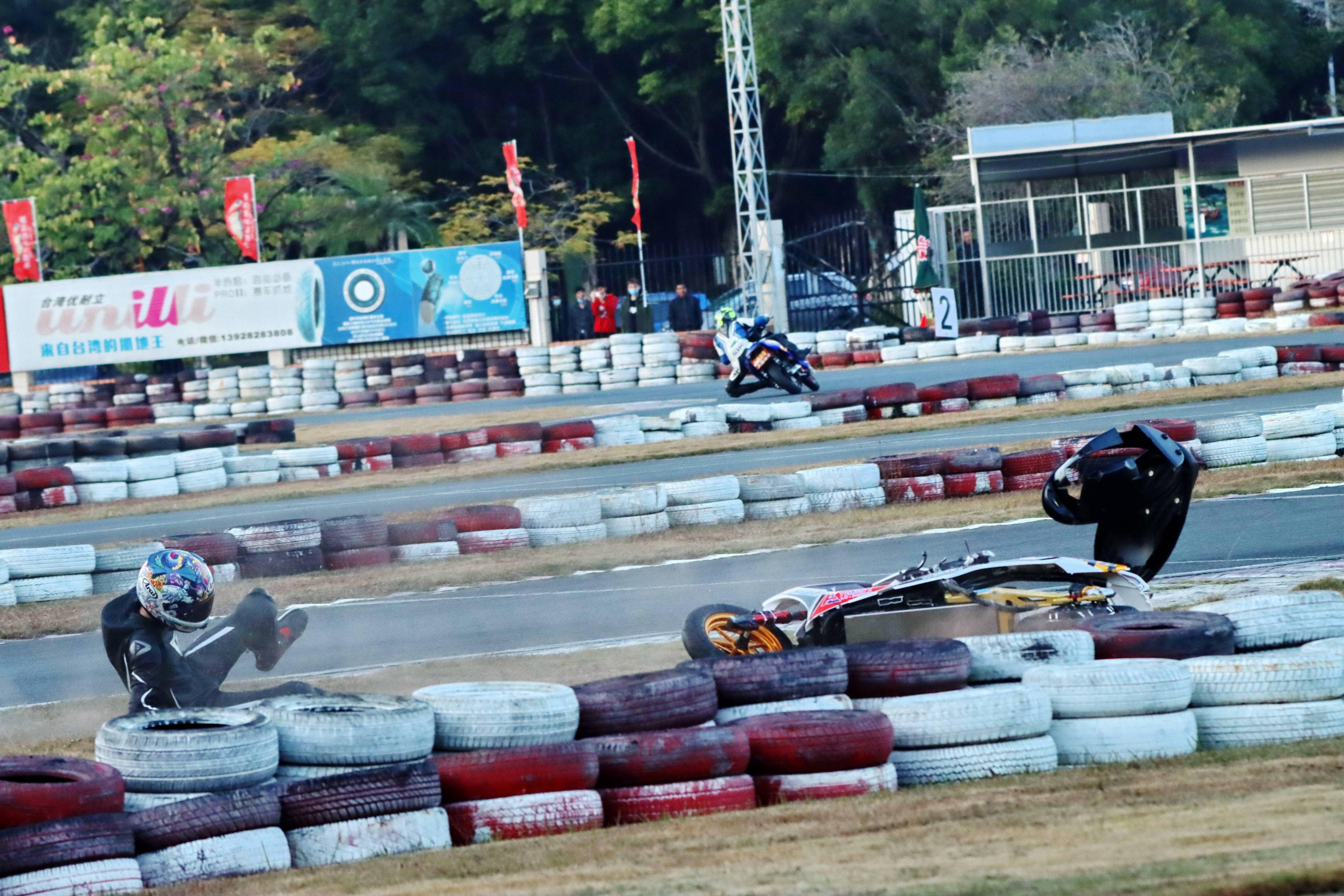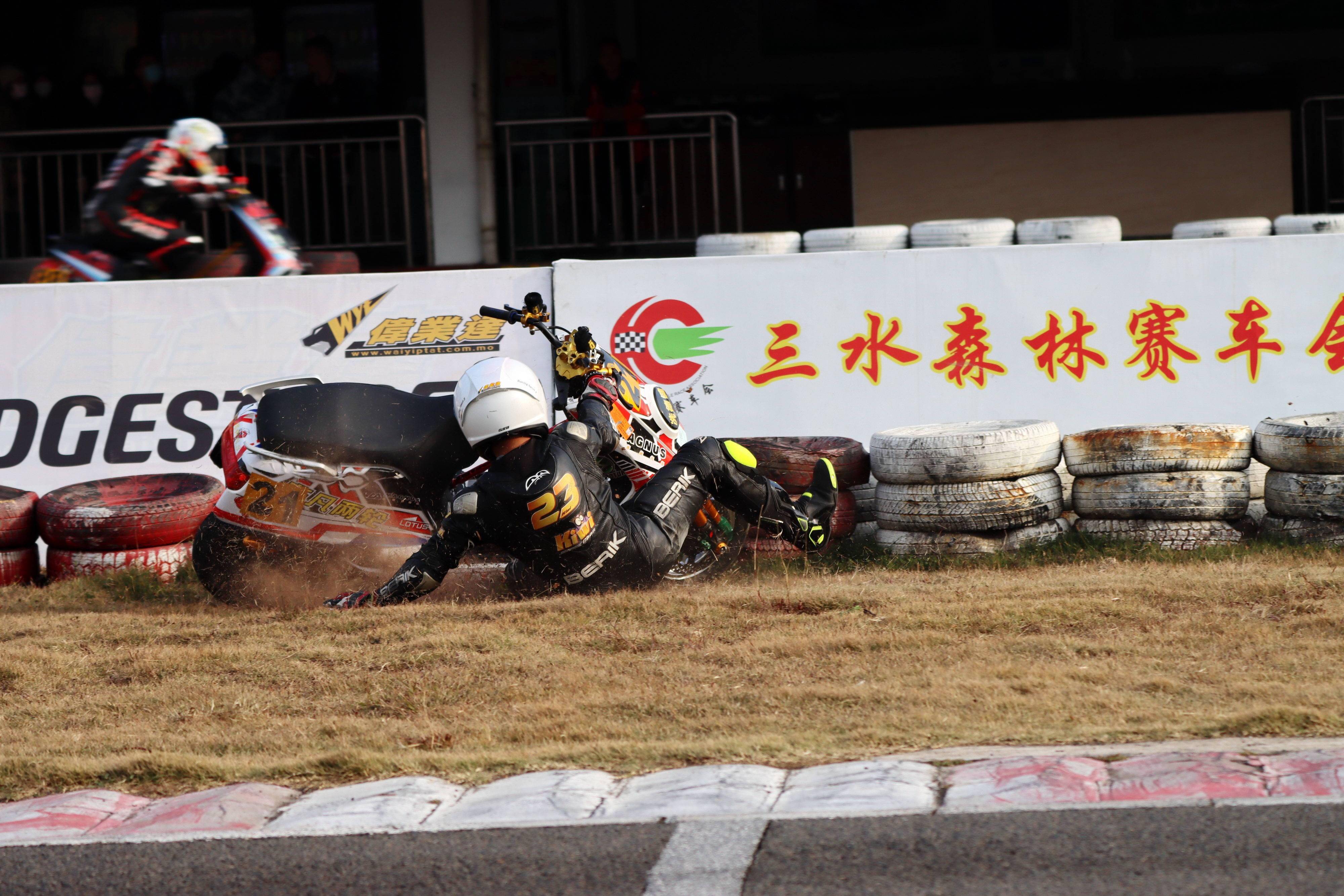 下面的圖片,去年 十二月 19 - 20 在廣東三水森林公園賽車場舉行的 2020 年三水森林賽車會摩托車大賽 偉業(yè)達杯第四回合,全順電驅(qū)動組、多位車手摔車的瞬間。