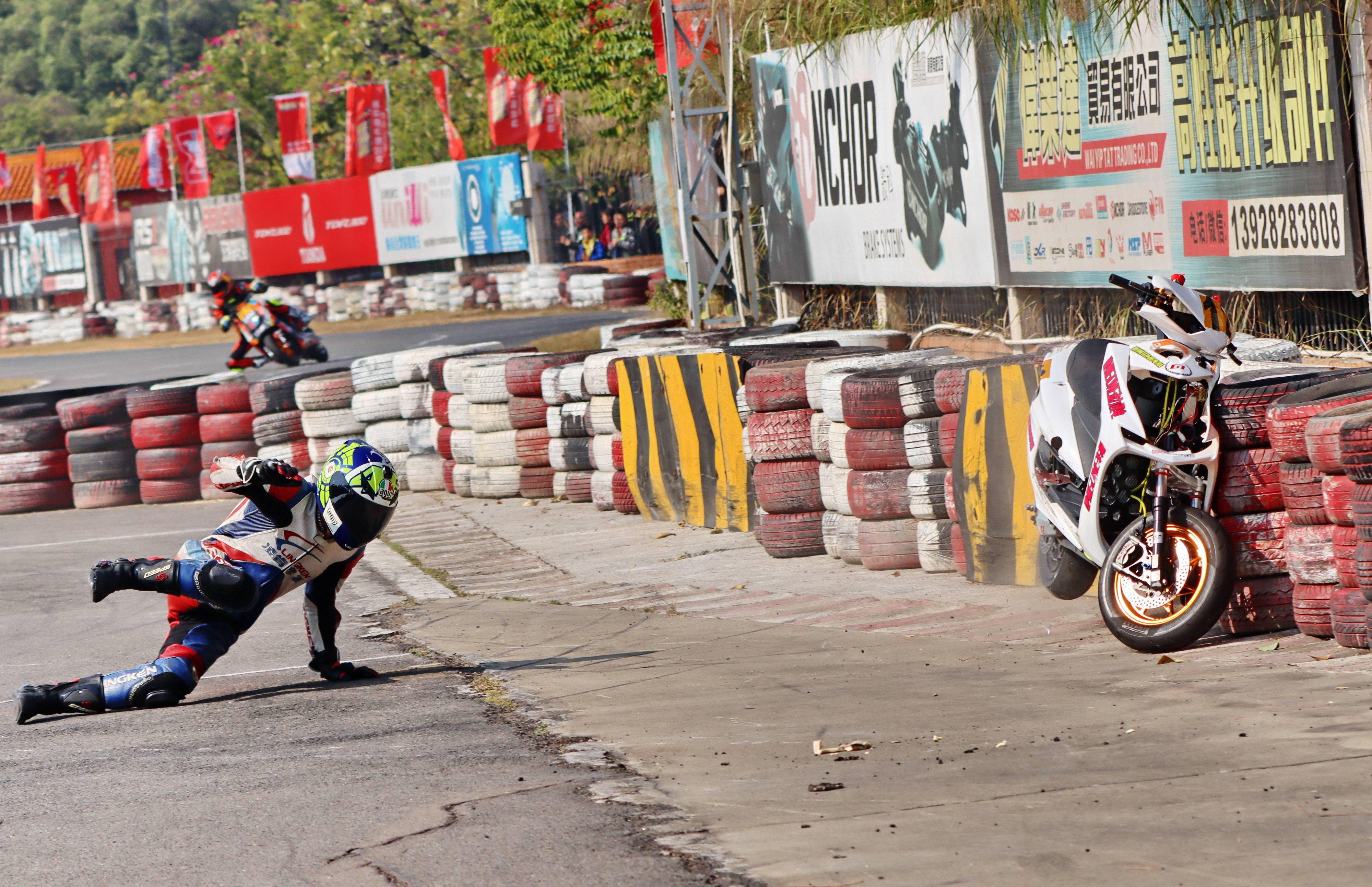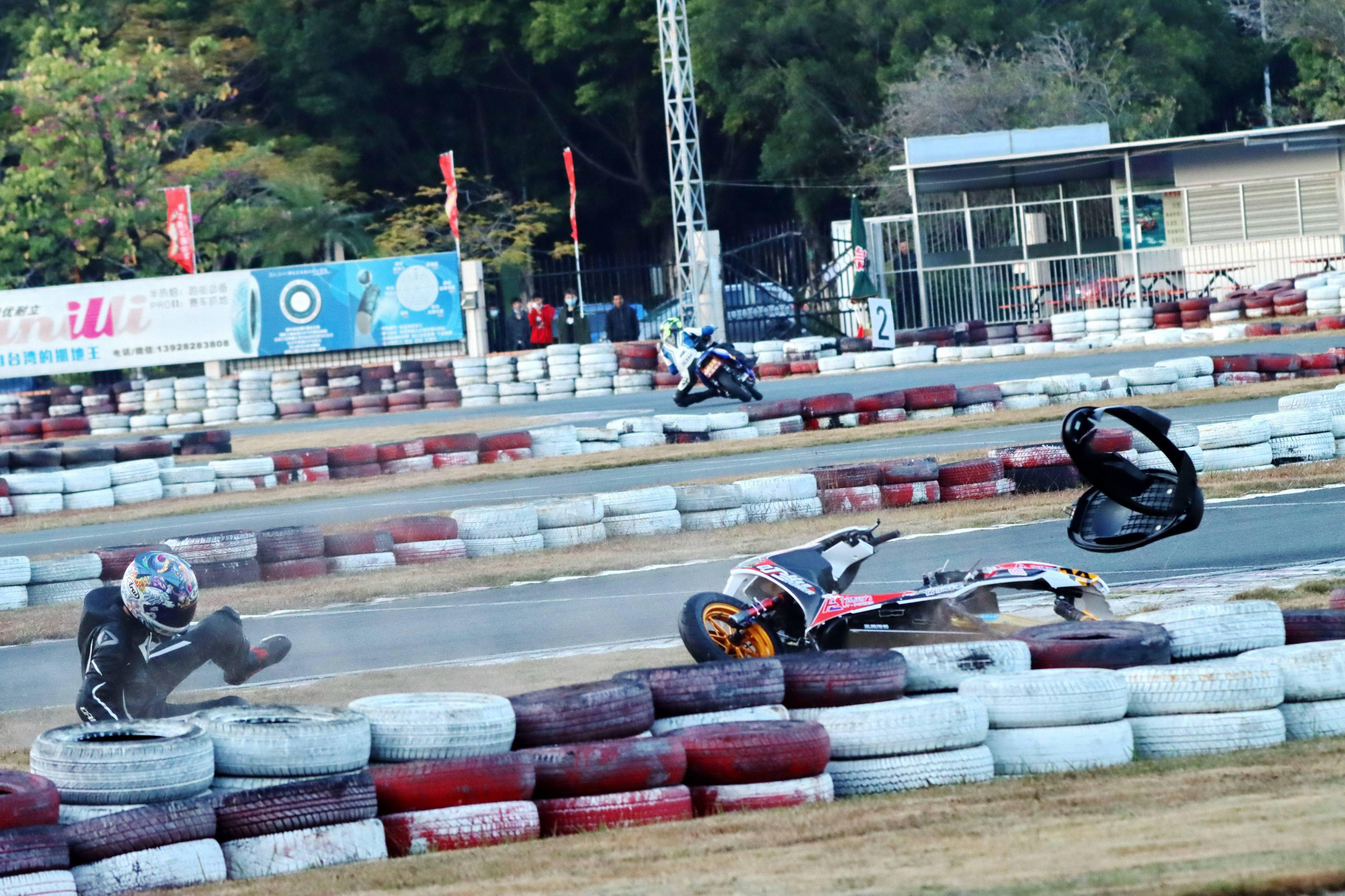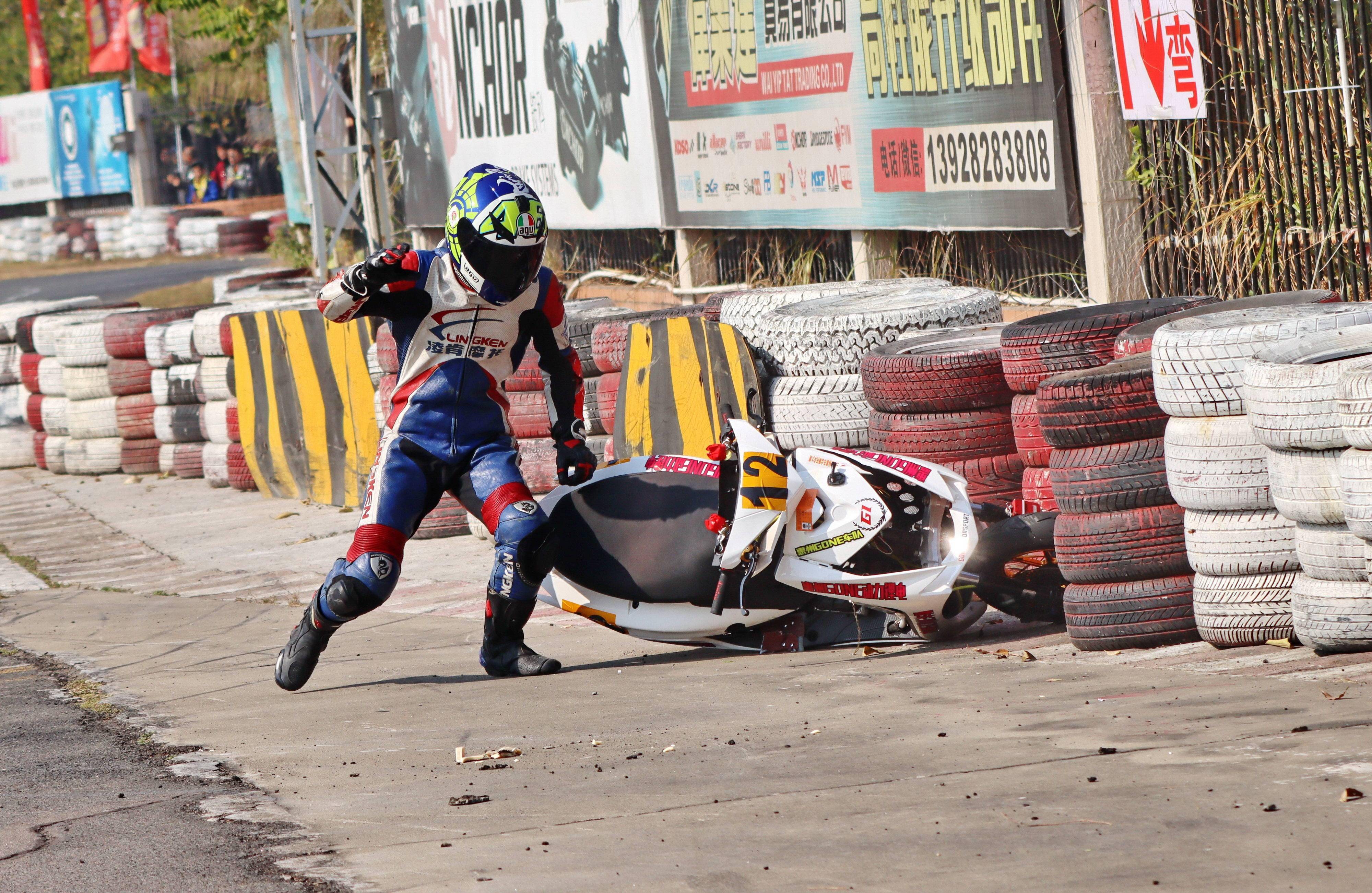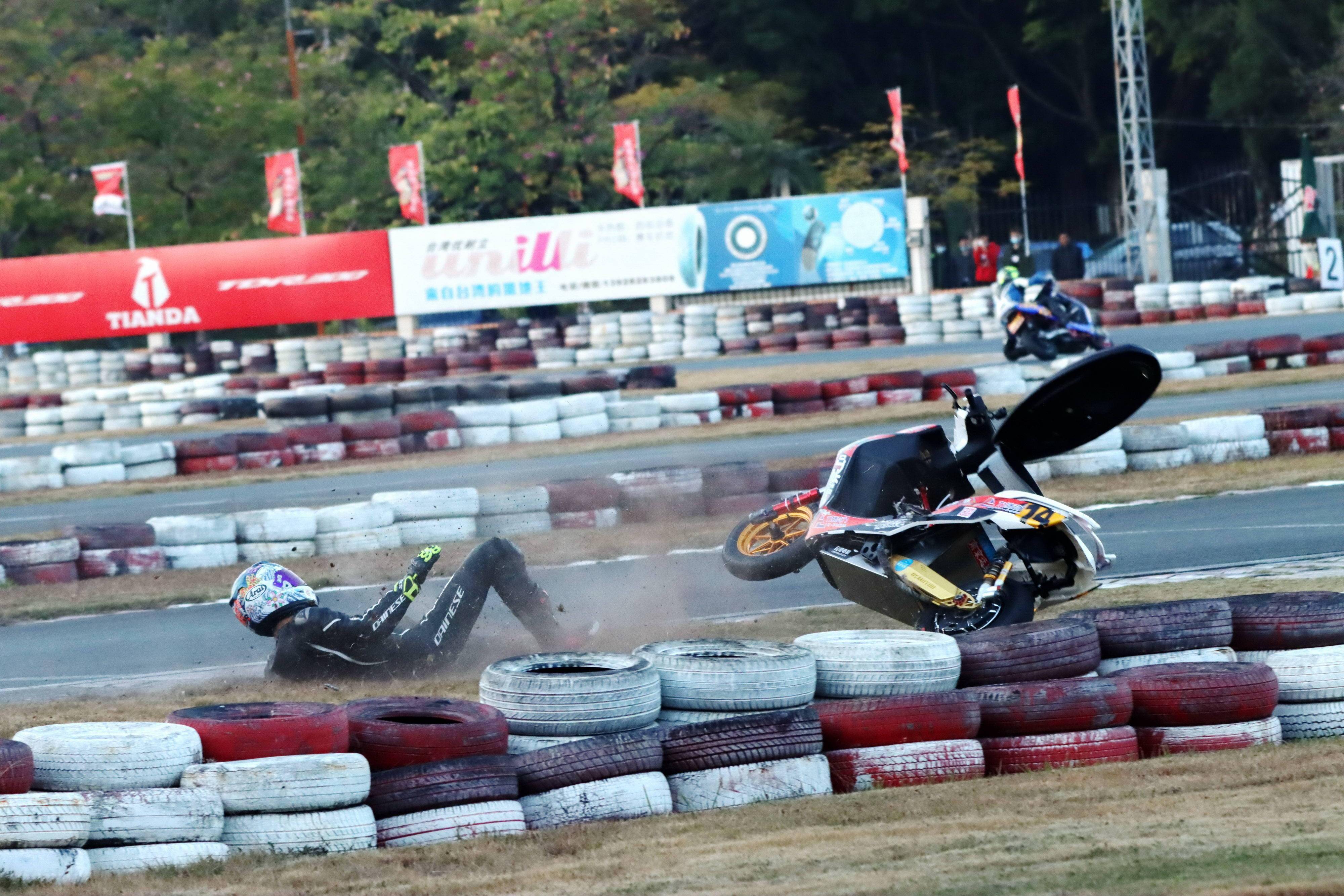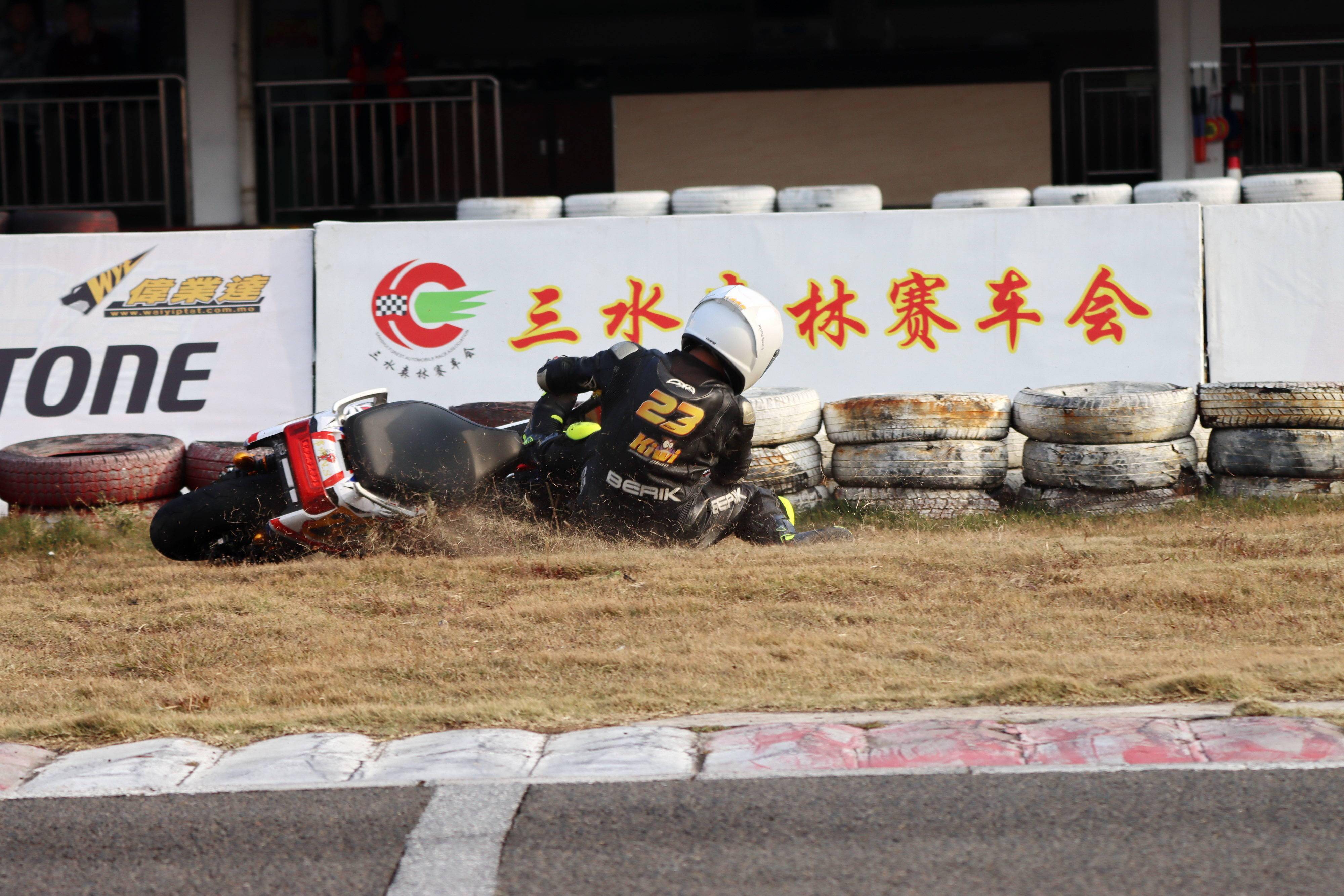 下面的圖片,去年 十二月 19 - 20 在廣東三水森林公園賽車場舉行的 2020 年三水森林賽車會摩托車大賽 偉業(yè)達杯第四回合,全順電驅(qū)動組、多位車手摔車的瞬間。