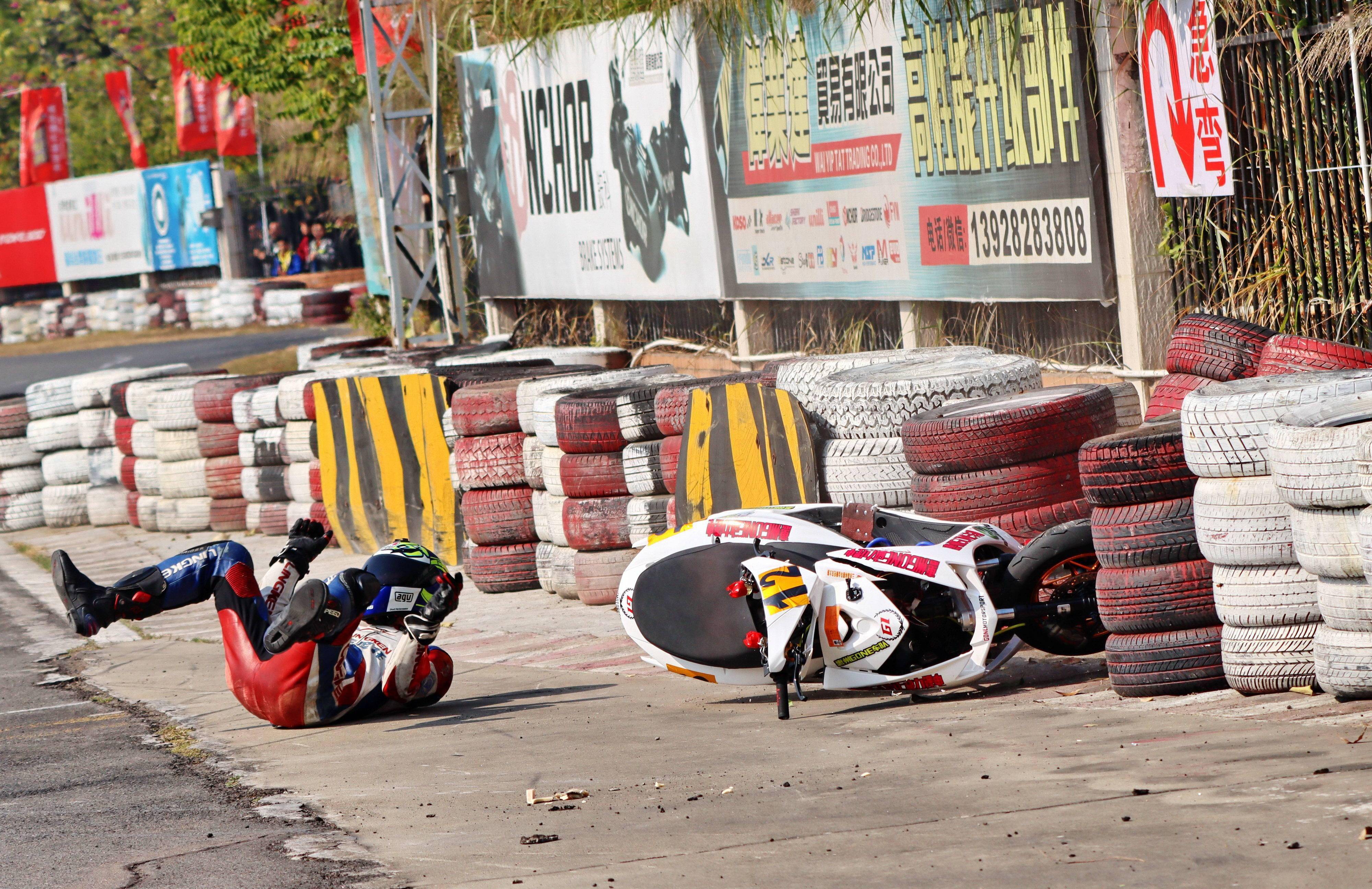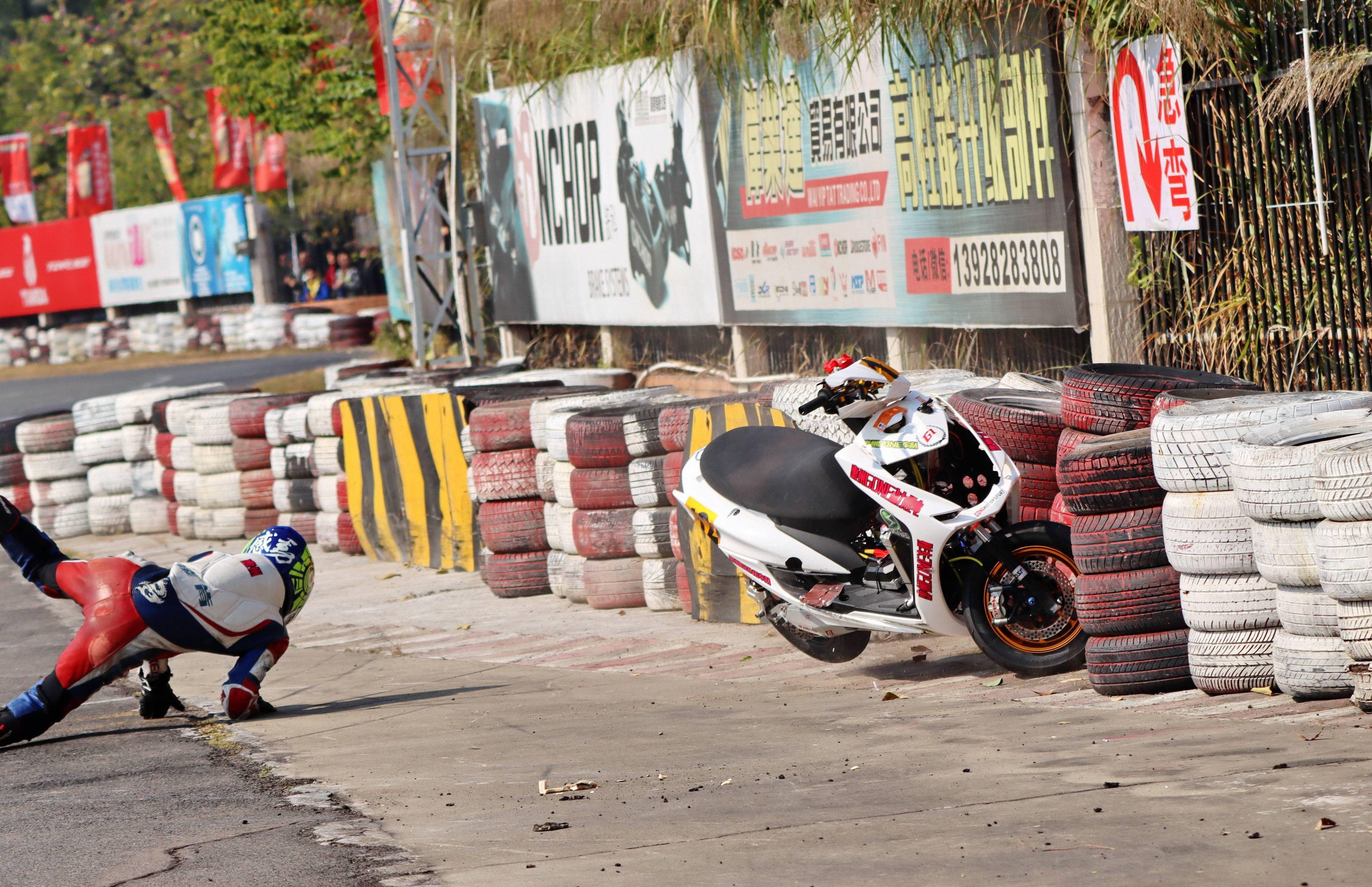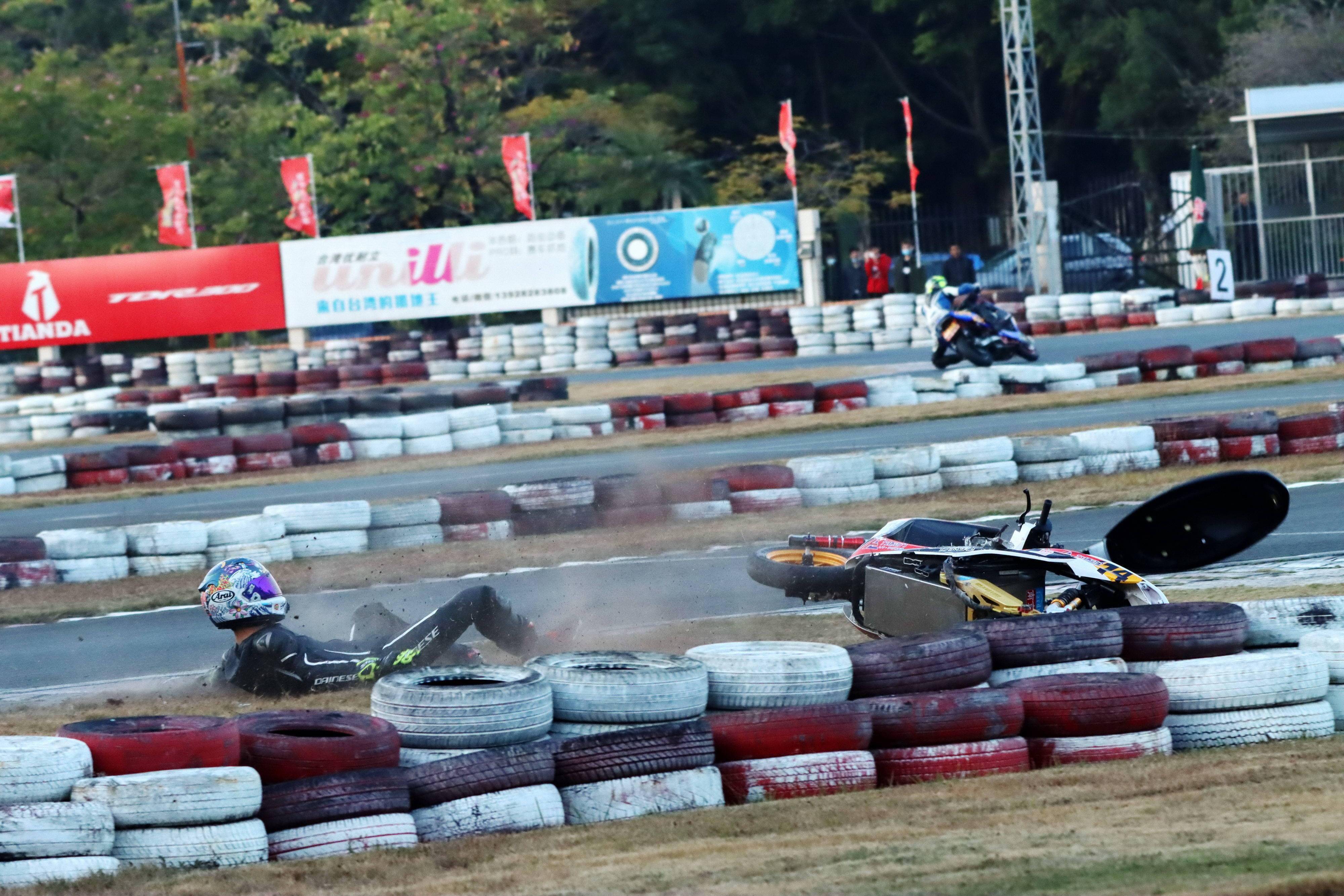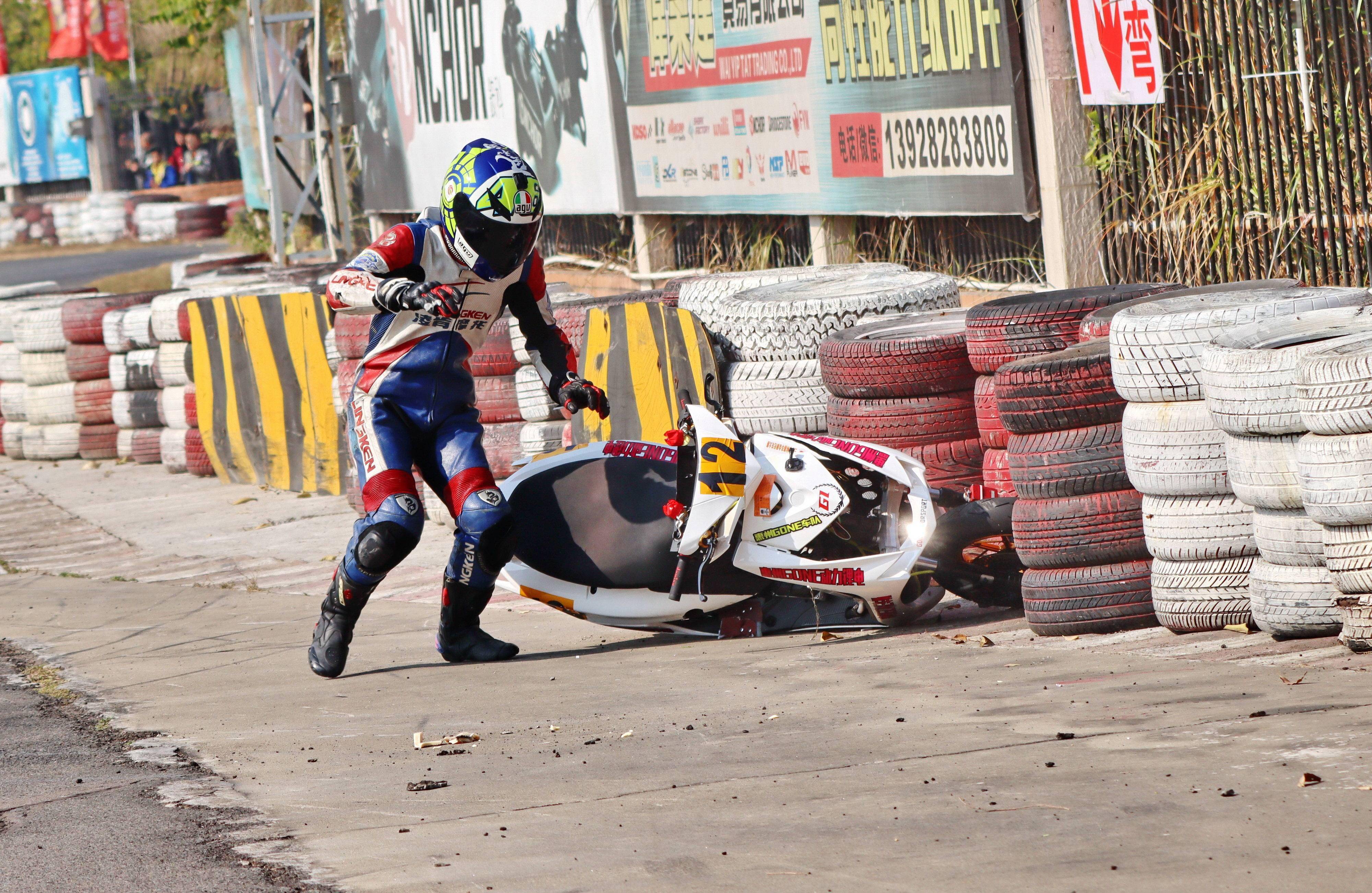 下面的圖片,去年 十二月 19 - 20 在廣東三水森林公園賽車場舉行的 2020 年三水森林賽車會摩托車大賽 偉業(yè)達杯第四回合,全順電驅(qū)動組、多位車手摔車的瞬間。