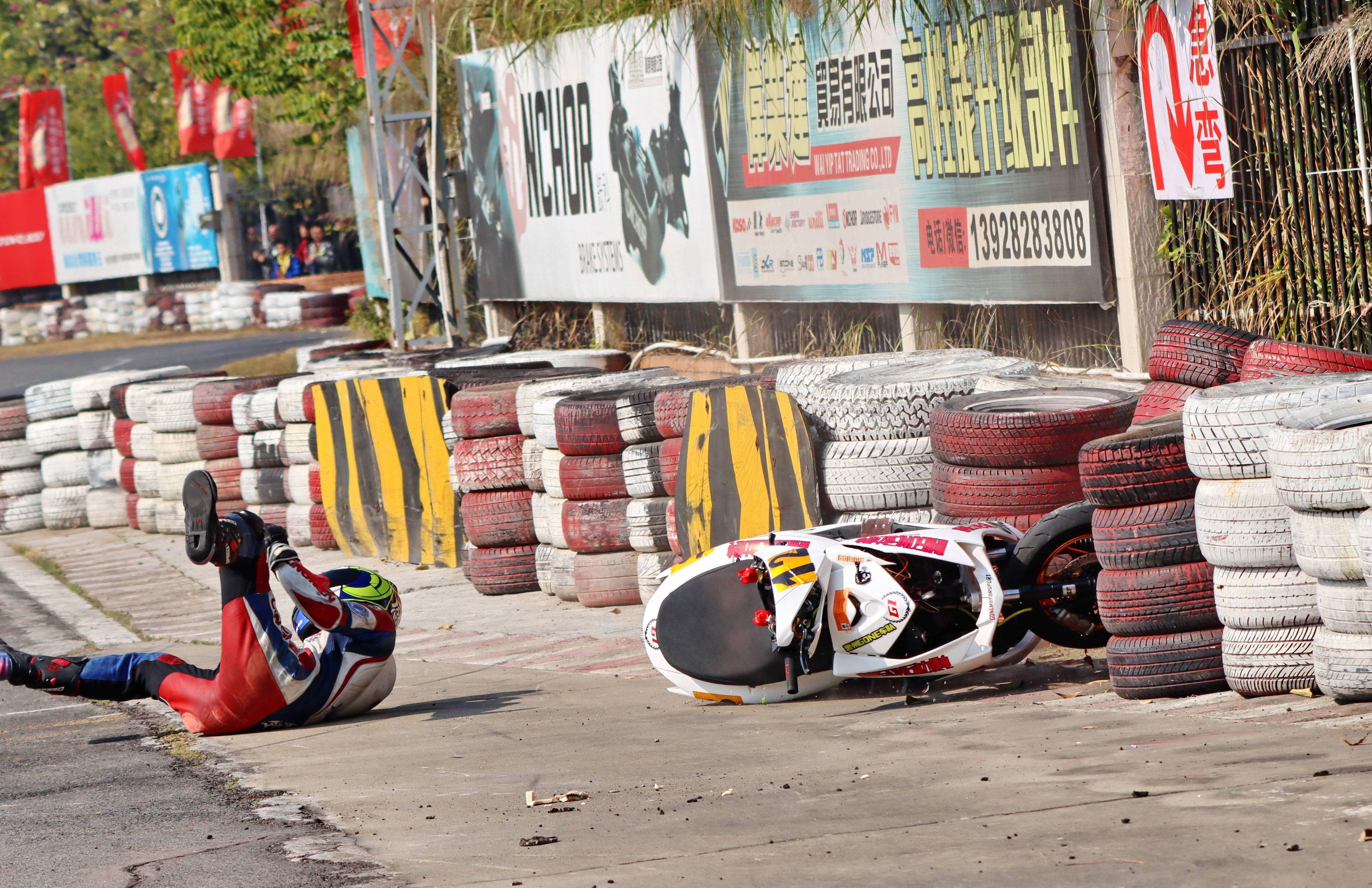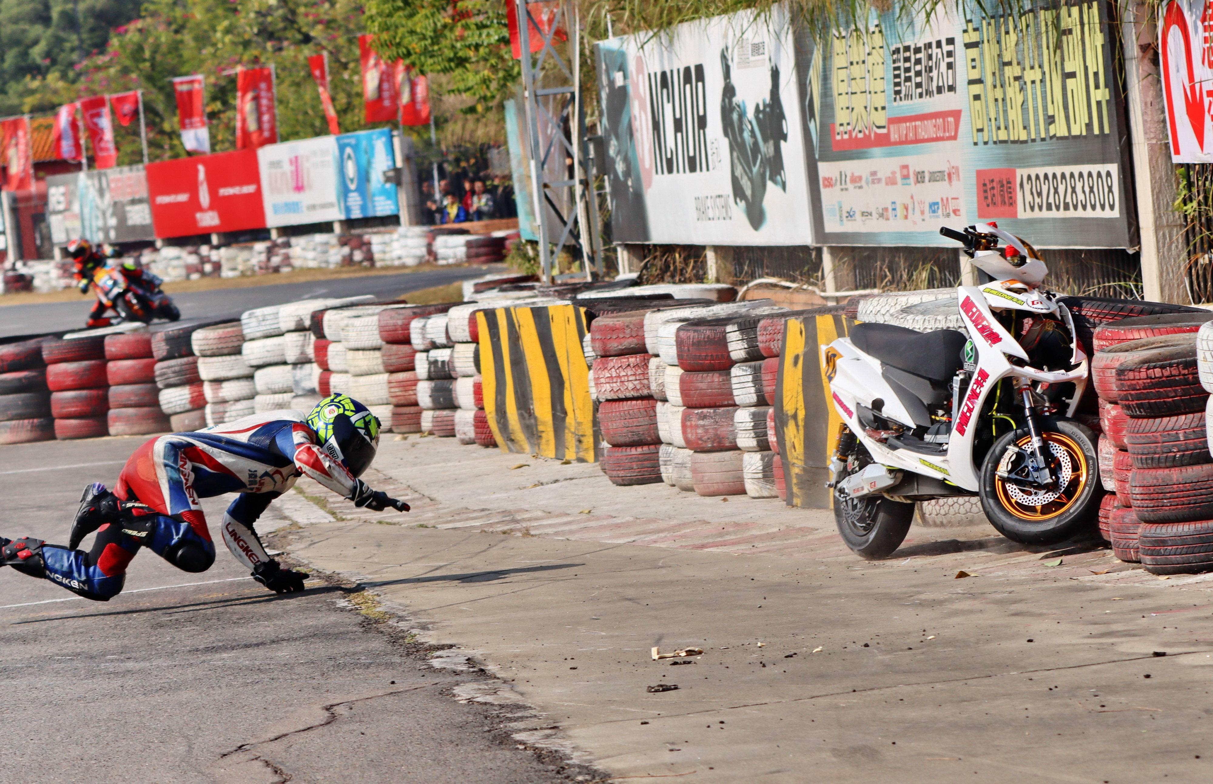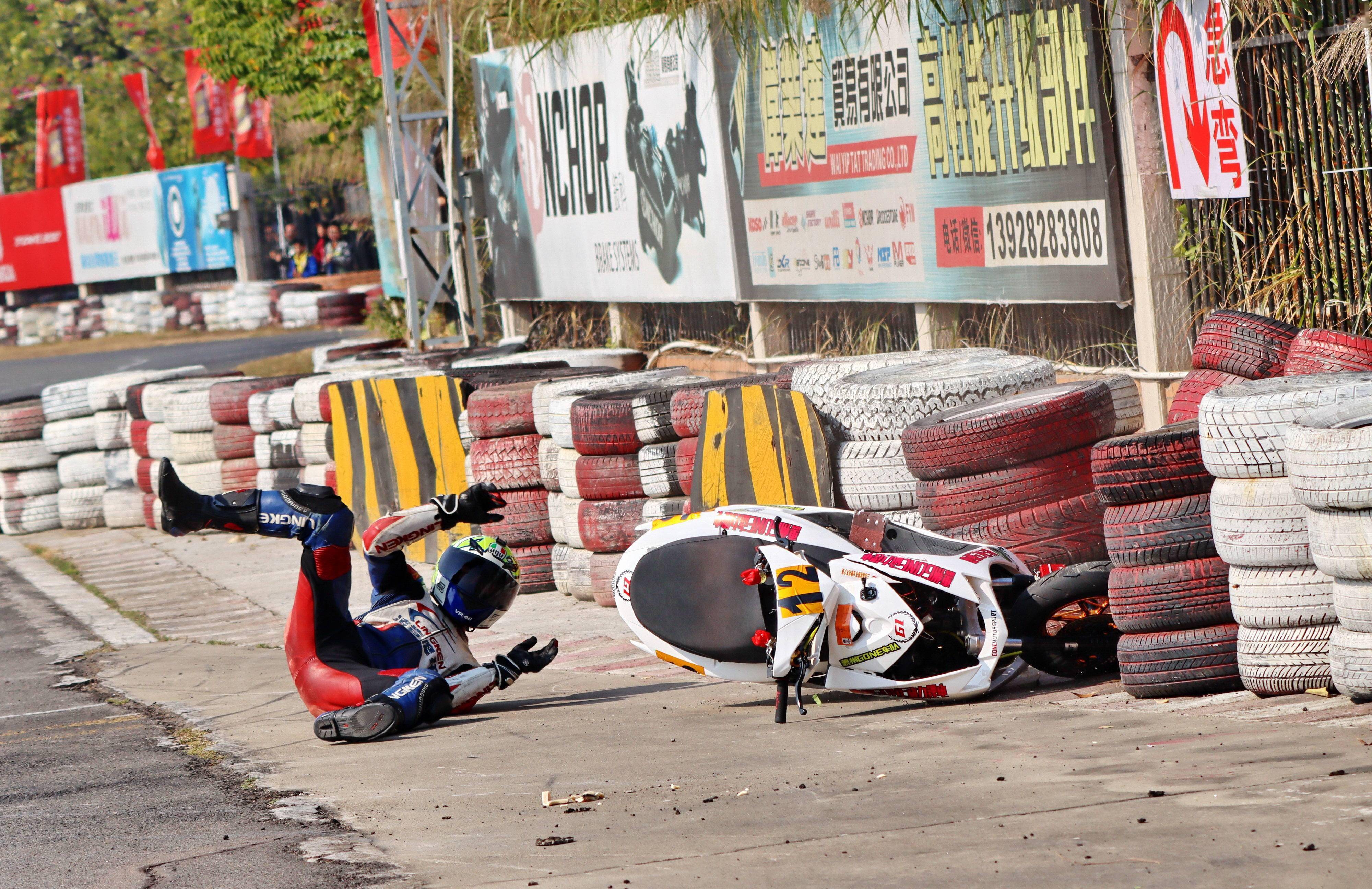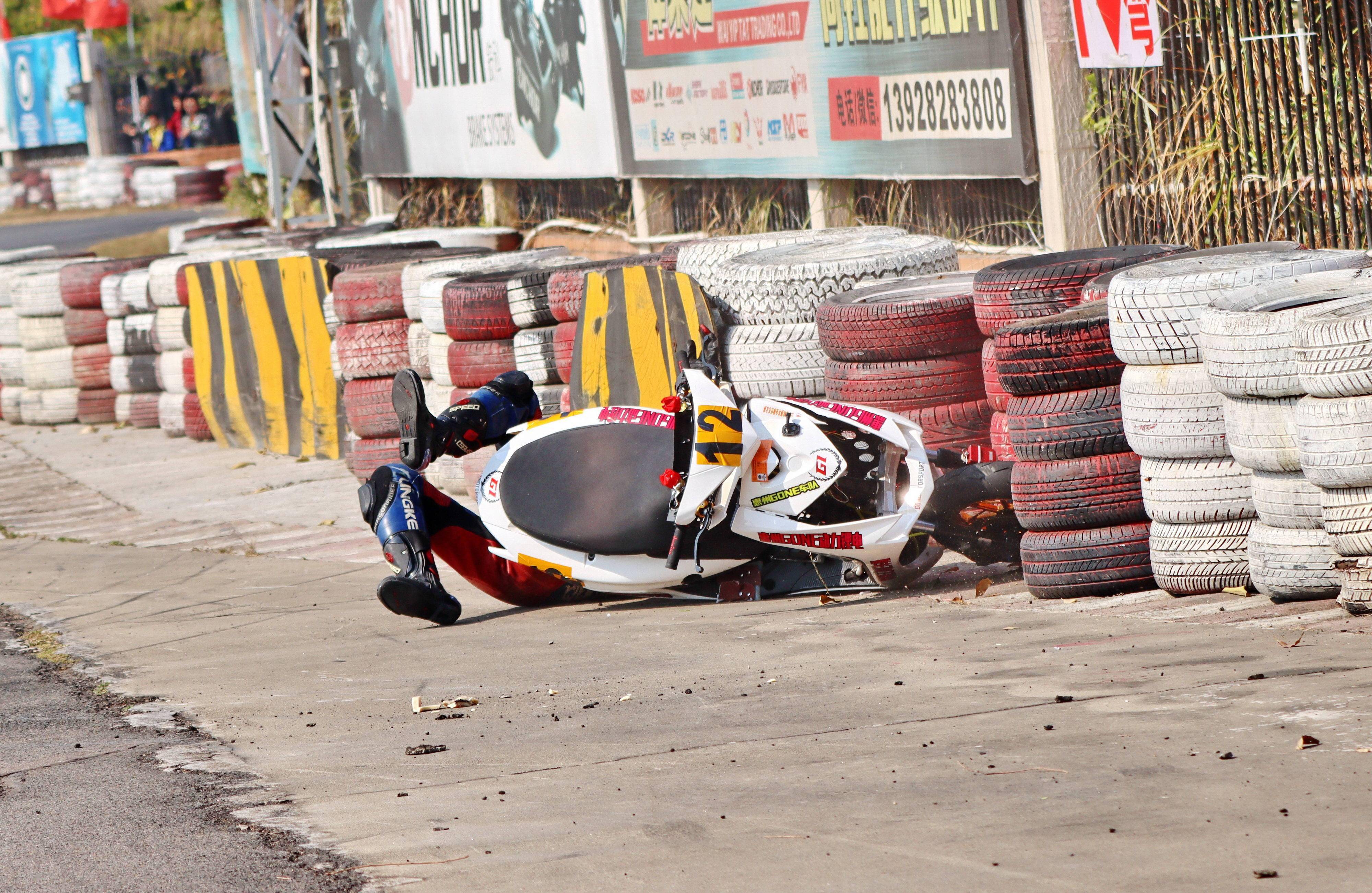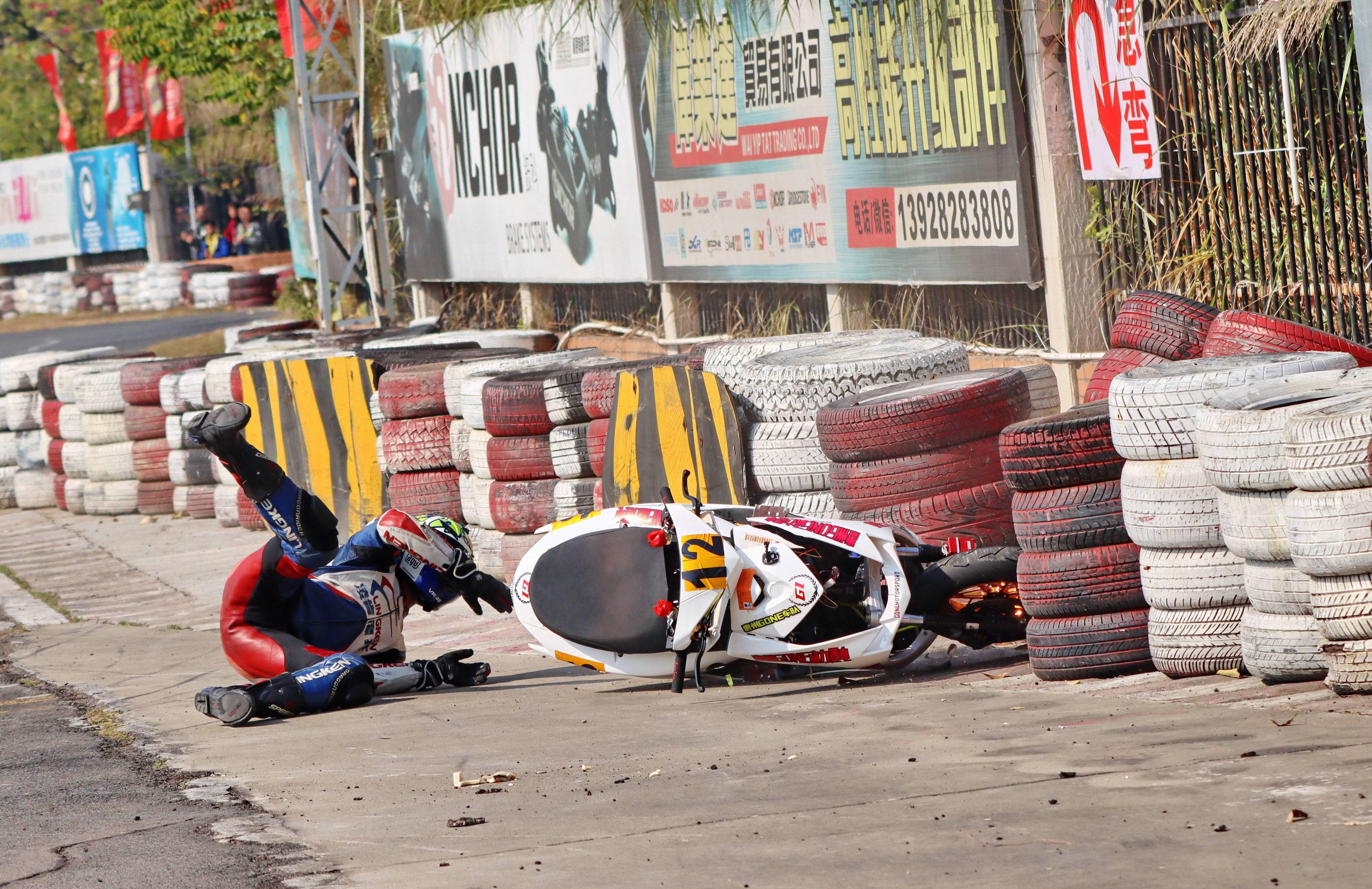 下面的圖片,去年 十二月 19 - 20 在廣東三水森林公園賽車場舉行的 2020 年三水森林賽車會摩托車大賽 偉業(yè)達杯第四回合,全順電驅(qū)動組、多位車手摔車的瞬間。
