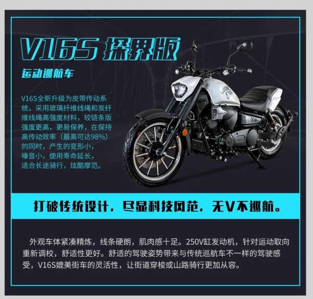 力帆V16探界版是在V16的基礎上進行了改進,比如更加具有美式風格的外形,更地道的皮帶傳動,手把角度加大騎行更舒適。