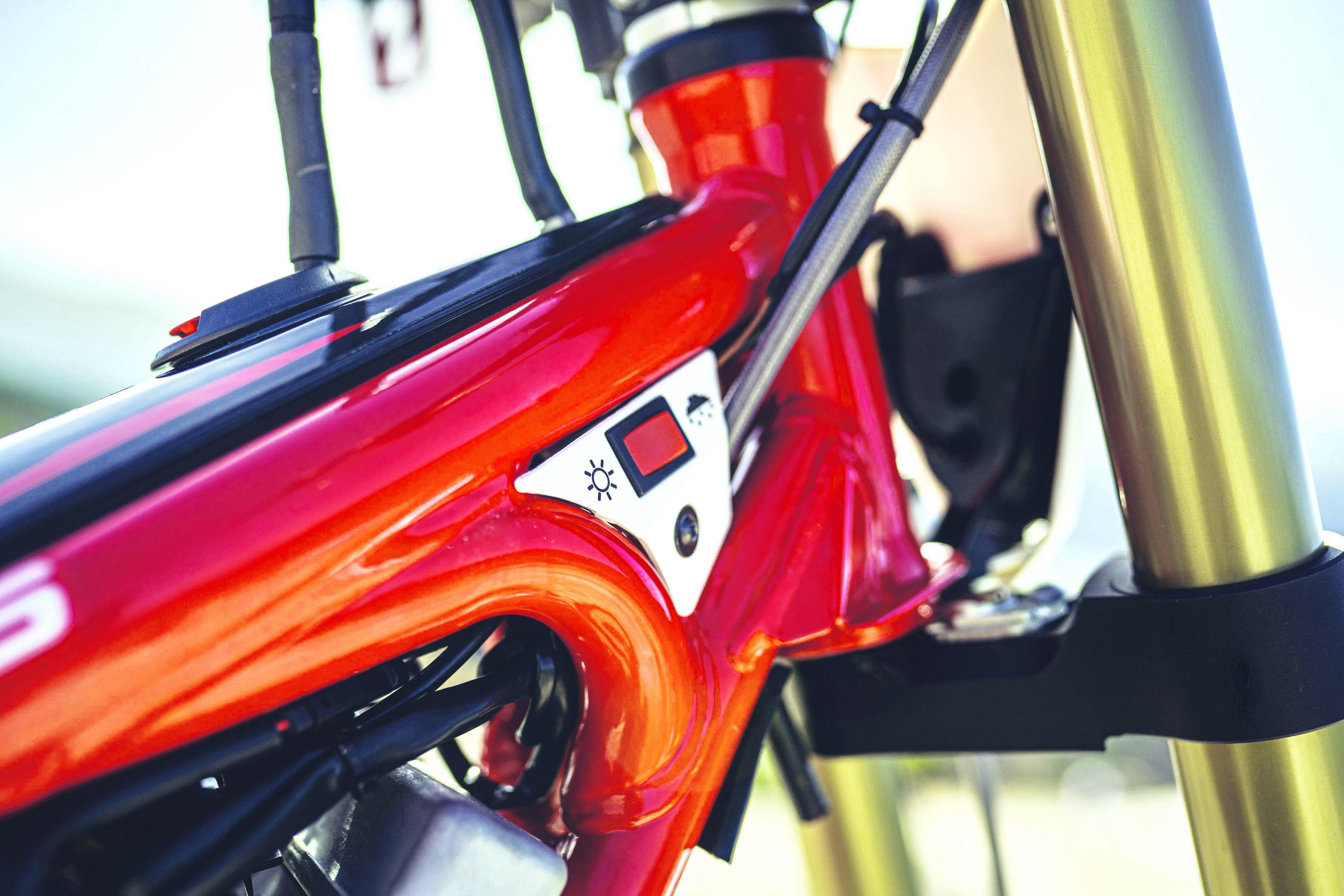 車體采用一副以厚度為 1.5 mm 鋼管制成的車架,該車架以機(jī)器人對(duì)原材料進(jìn)行切割和激光焊接加工而成,以確保車架的精度、韌性和持久的耐用性,表面采用堅(jiān)硬的紅色粉末涂層進(jìn)行過(guò)精加工。廠方稱,該車架能夠?yàn)檐囀痔峁┮粋€(gè)精確的騎行反饋,以及非常重要的、高效的能量吸收。