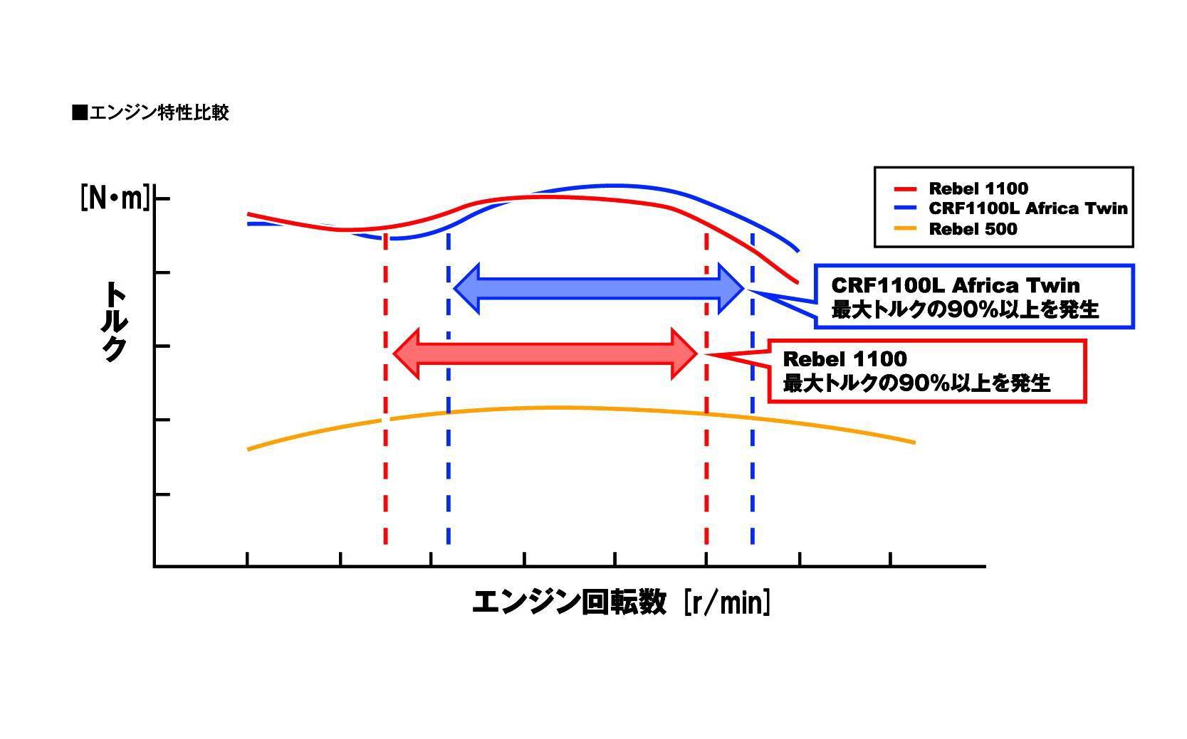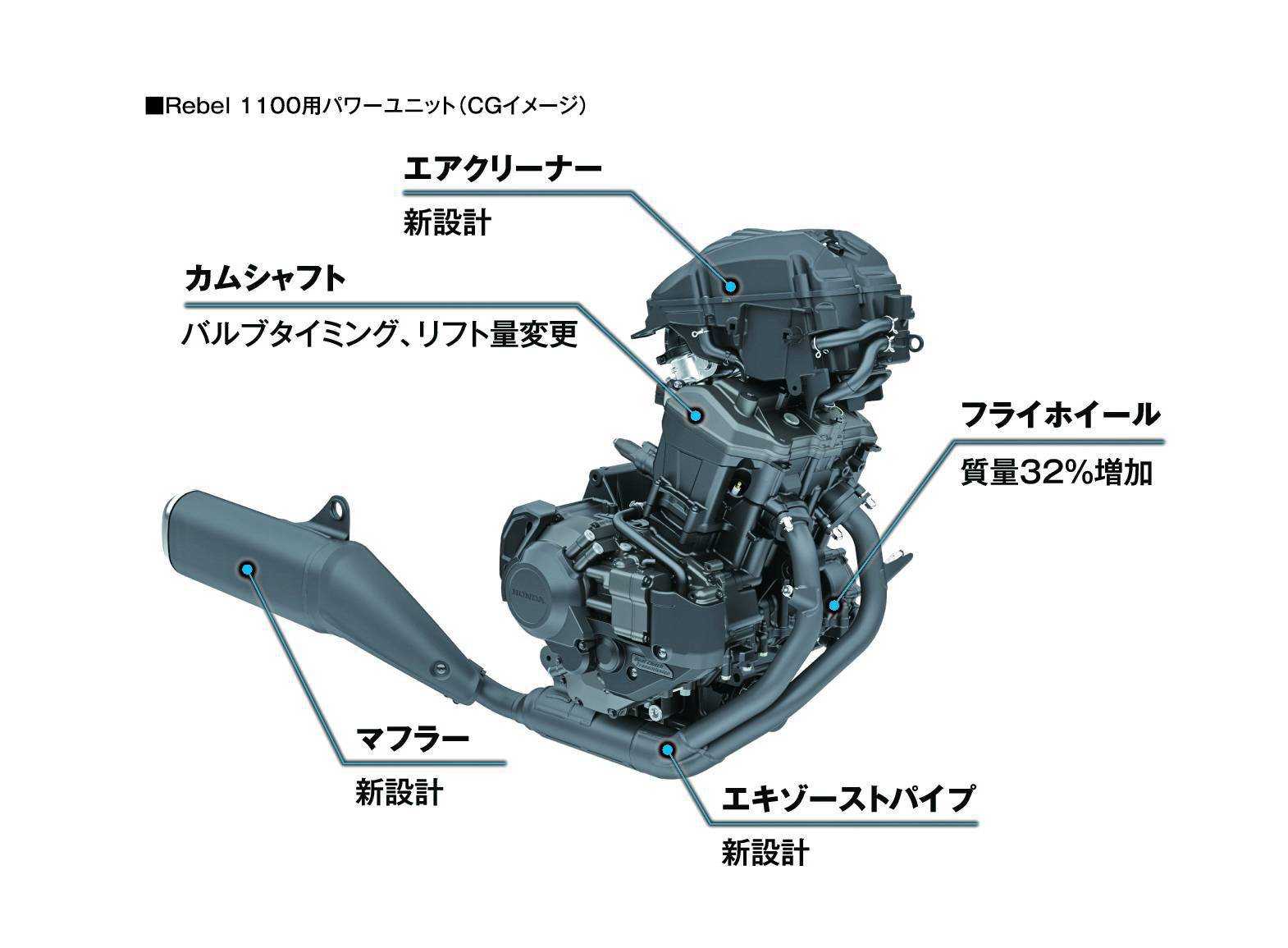 盡管是來自相同的平臺、也保持了最初的基本結構,但 Rebel 1100 的發(fā)動機經(jīng)過了各種的關鍵改動,完全改變了它原本探險車發(fā)動機的性質和駕駛感覺,以迎合其新的、巡航車的輸出特性。通過增加了 32% 的曲軸飛輪質量、以獲得更大的慣性,使 Rebel 1100 在低轉速的時候、有著更好的發(fā)動機響應。而充滿力量感的低轉速輸出、向來是多數(shù)用戶對這一類美式巡航之駕駛特性的印象。