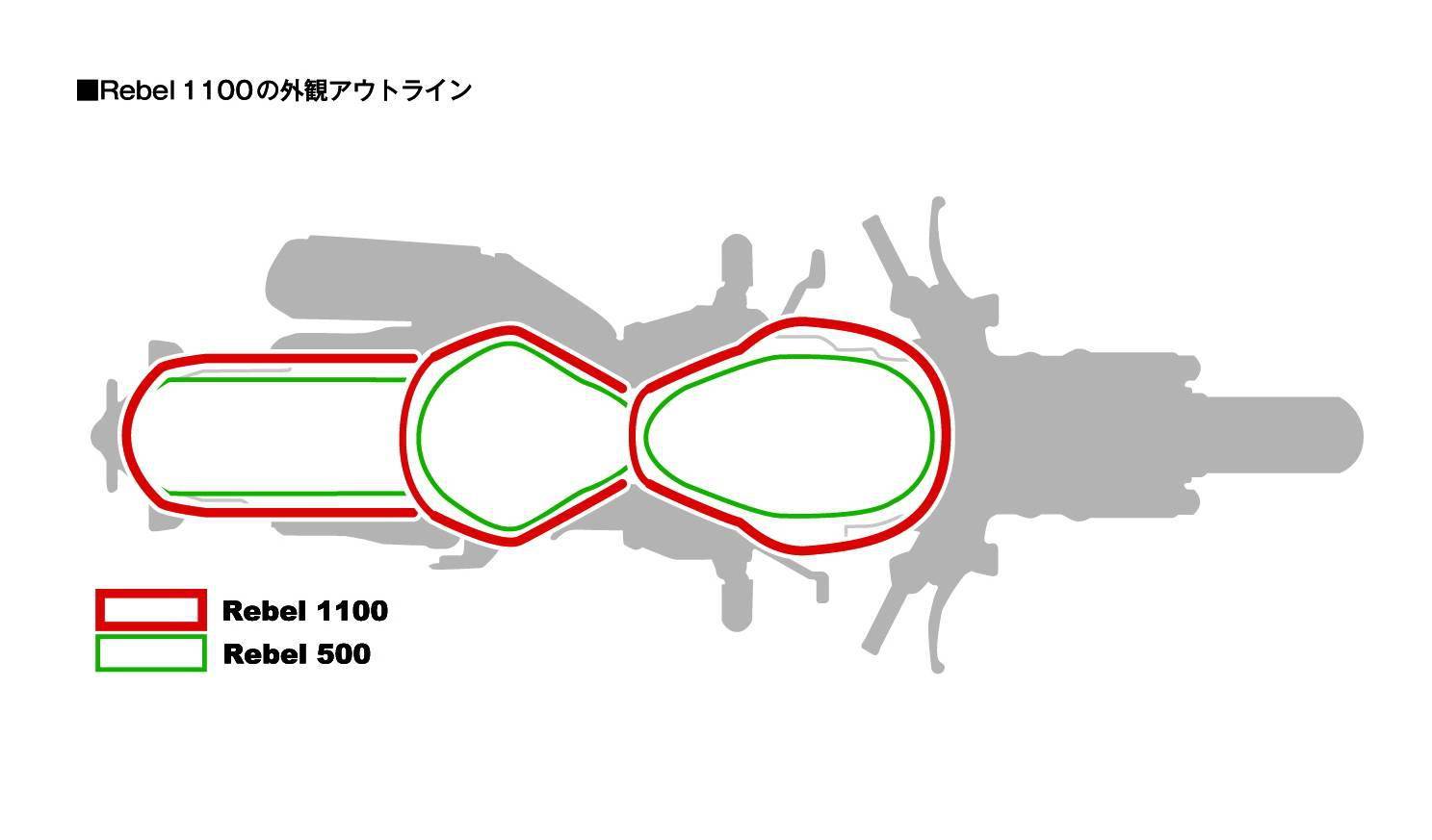 車體方面,Rebel 1100 的外觀由廠方在美國分公司的開發(fā)部門負責設計,采用了與上一設計作品 Rebel 500 相同的,一個簡單、原始和有著 “ 未經(jīng)加工 ” 風格的造型,全車呈一個長而低的輪廓,遍及全車每一個視覺可達之處都存在著的設計線索,演繹著外觀開發(fā)團隊對極簡主義的理解。