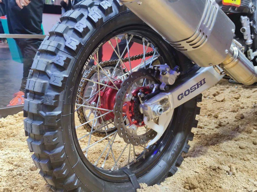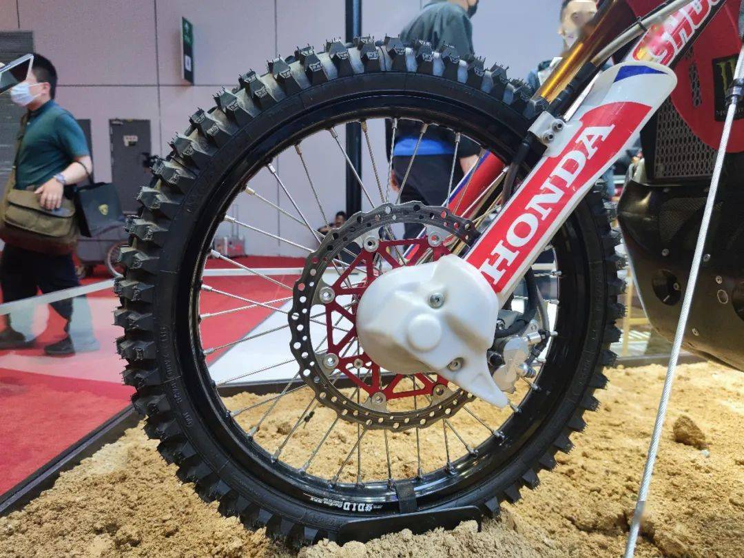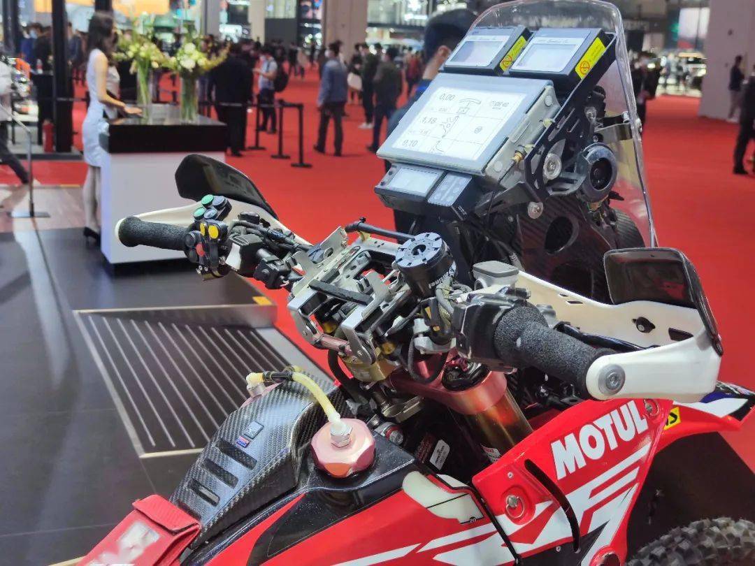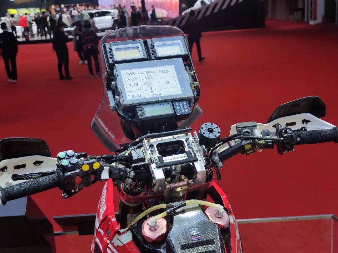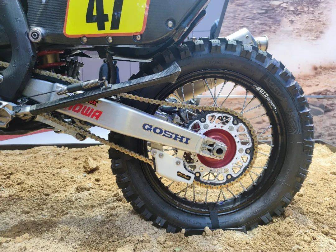 制動(dòng)系統(tǒng)為Nissin品牌,前雙活塞配300mm制動(dòng)盤,后制動(dòng)為單活塞配240mm制動(dòng)盤。為了減輕重量,主車架采用鋁合金材質(zhì),副車架則采用碳纖維材質(zhì),讓整車的整備質(zhì)量在180kg左右。輪胎采用米其林 Desert Race賽事專用輪胎。