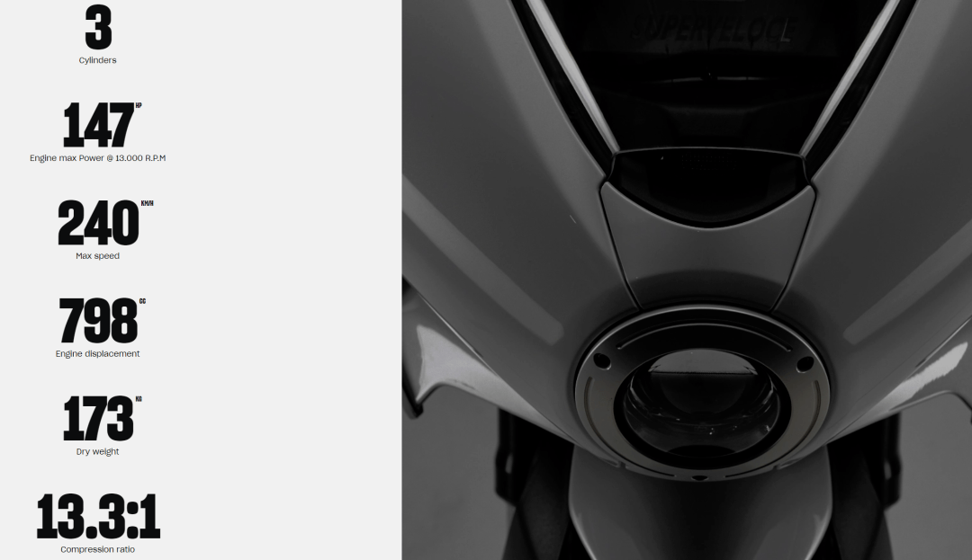 MV AgustaSuperveloce車系在這次改款中對發(fā)動機升級了全新的DLC涂層、鈦材料的氣門導(dǎo)管、加大噴油嘴、增加0.5Bar噴油壓力和重新設(shè)計的排氣系統(tǒng),使得這臺798mL排量的并列三缸發(fā)動機在滿足歐5法規(guī)的同時達到了147HP(13000r/min)的最大馬力和88N·m(10100r/min)的最大扭矩。最高速度可以超過240km/h。