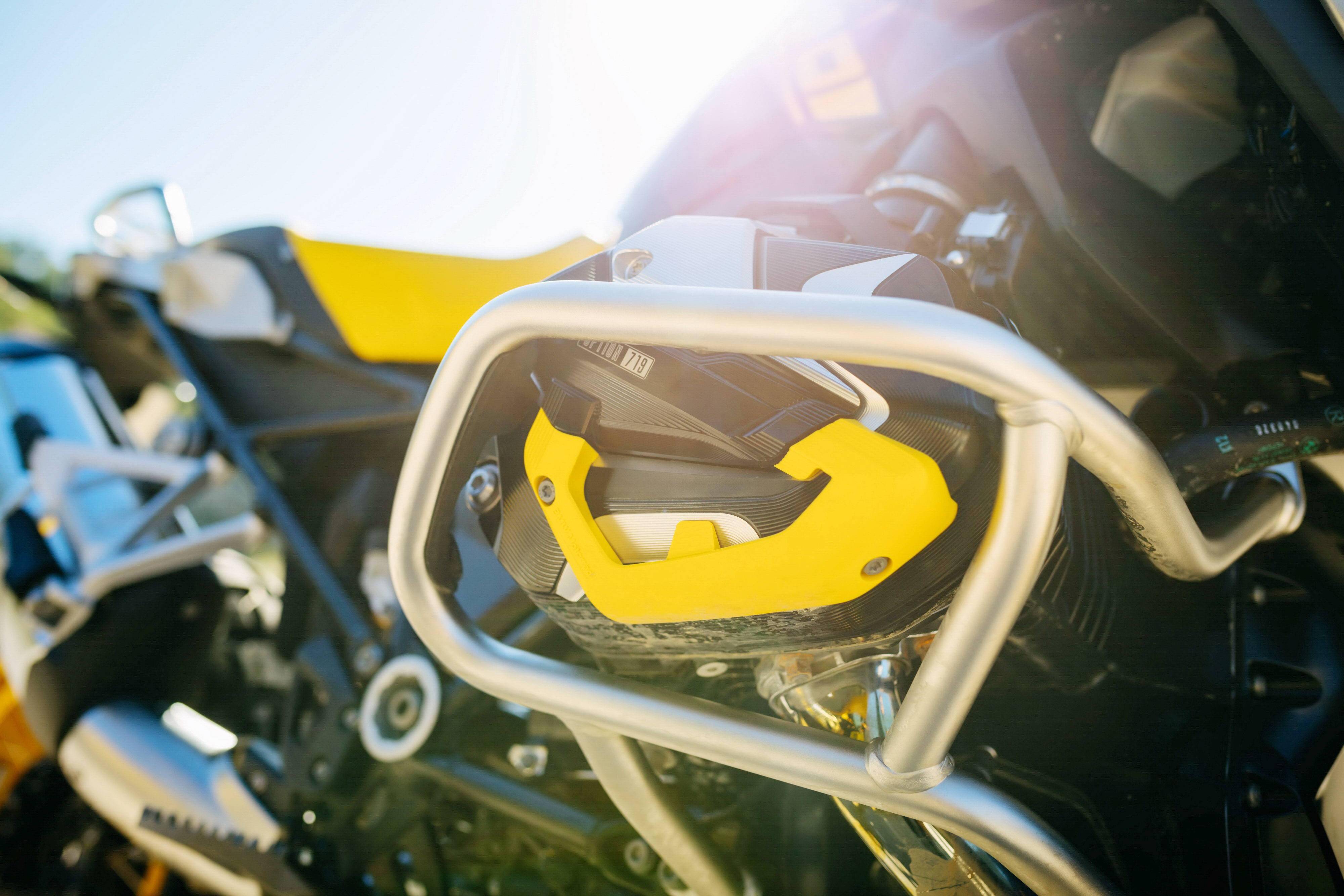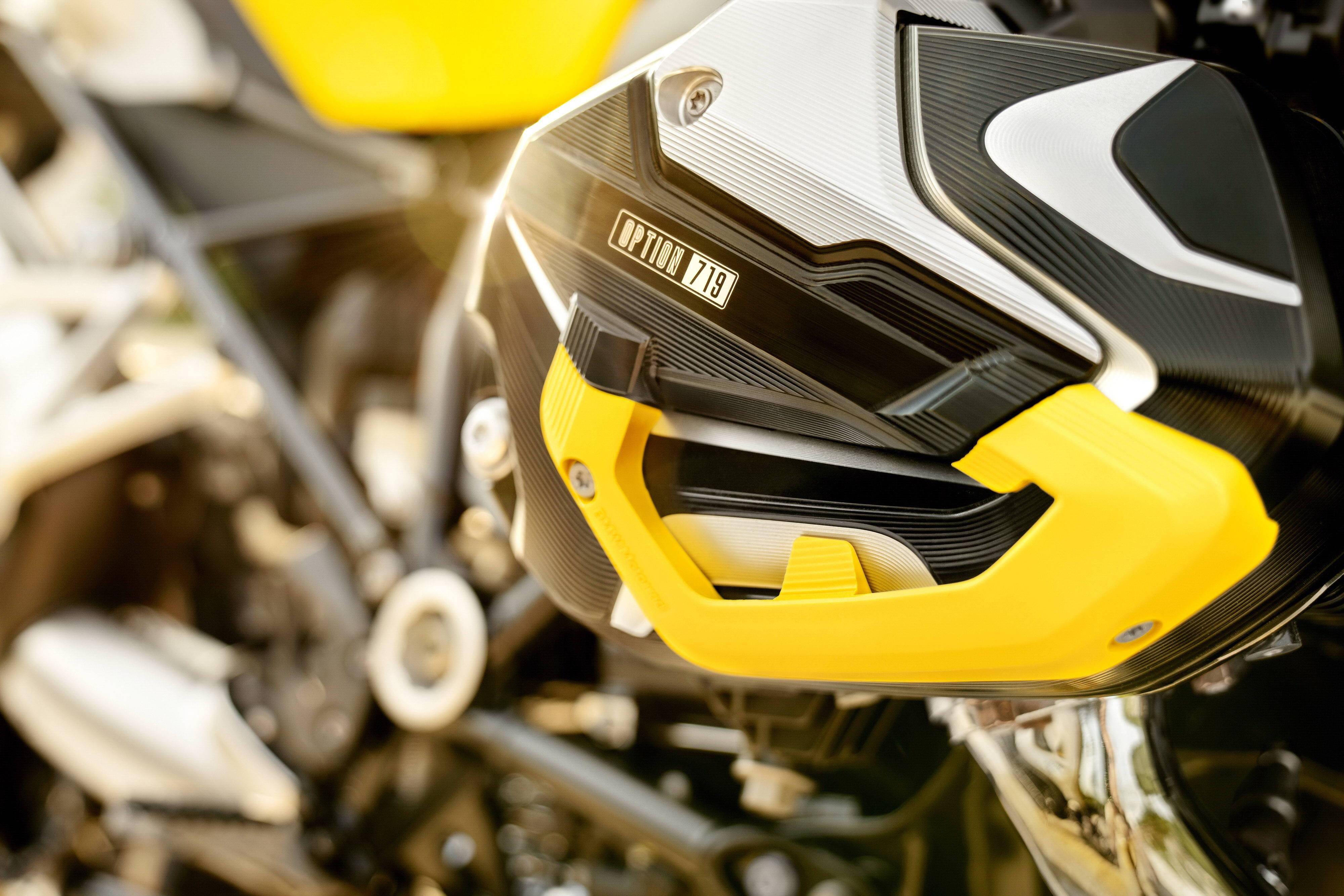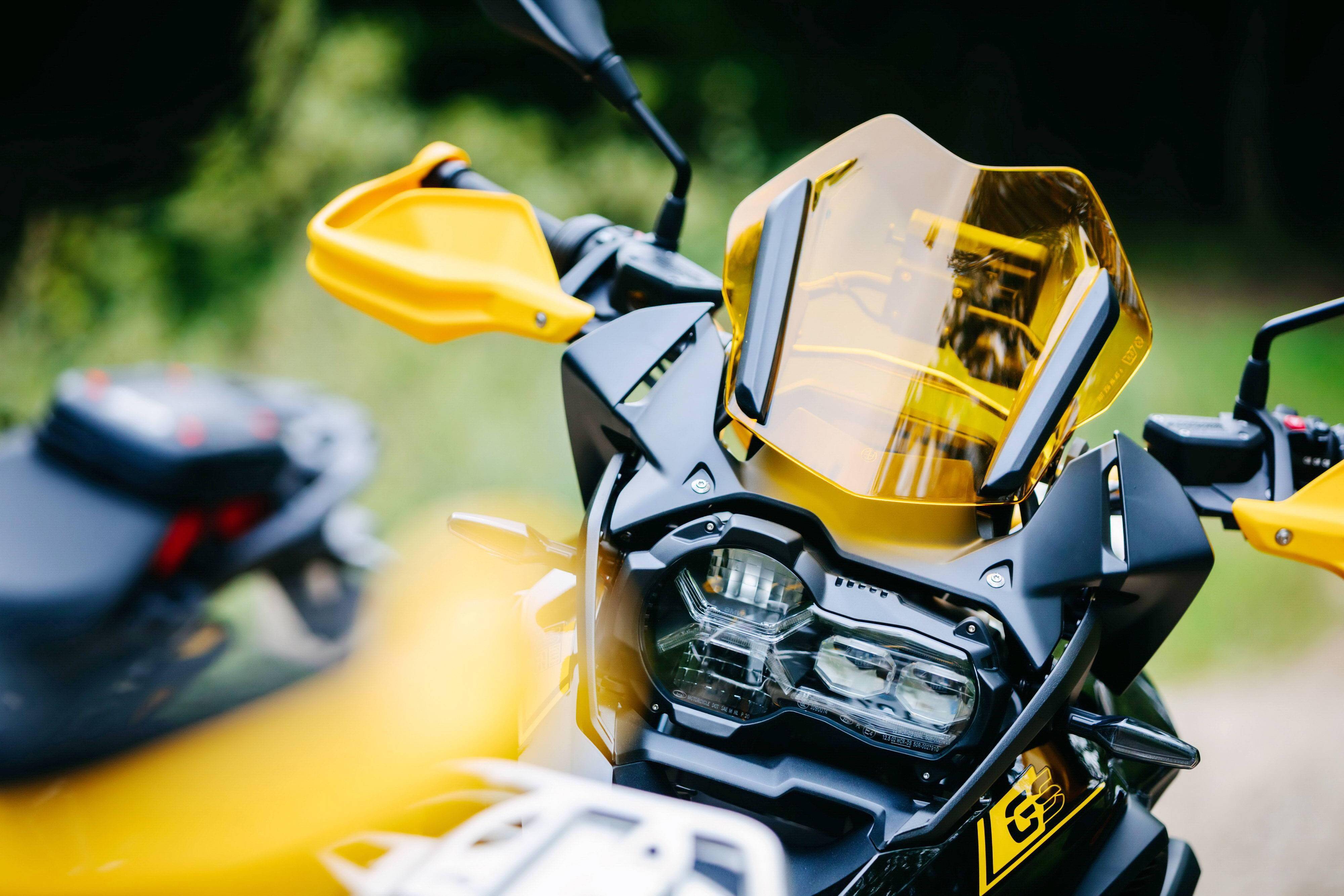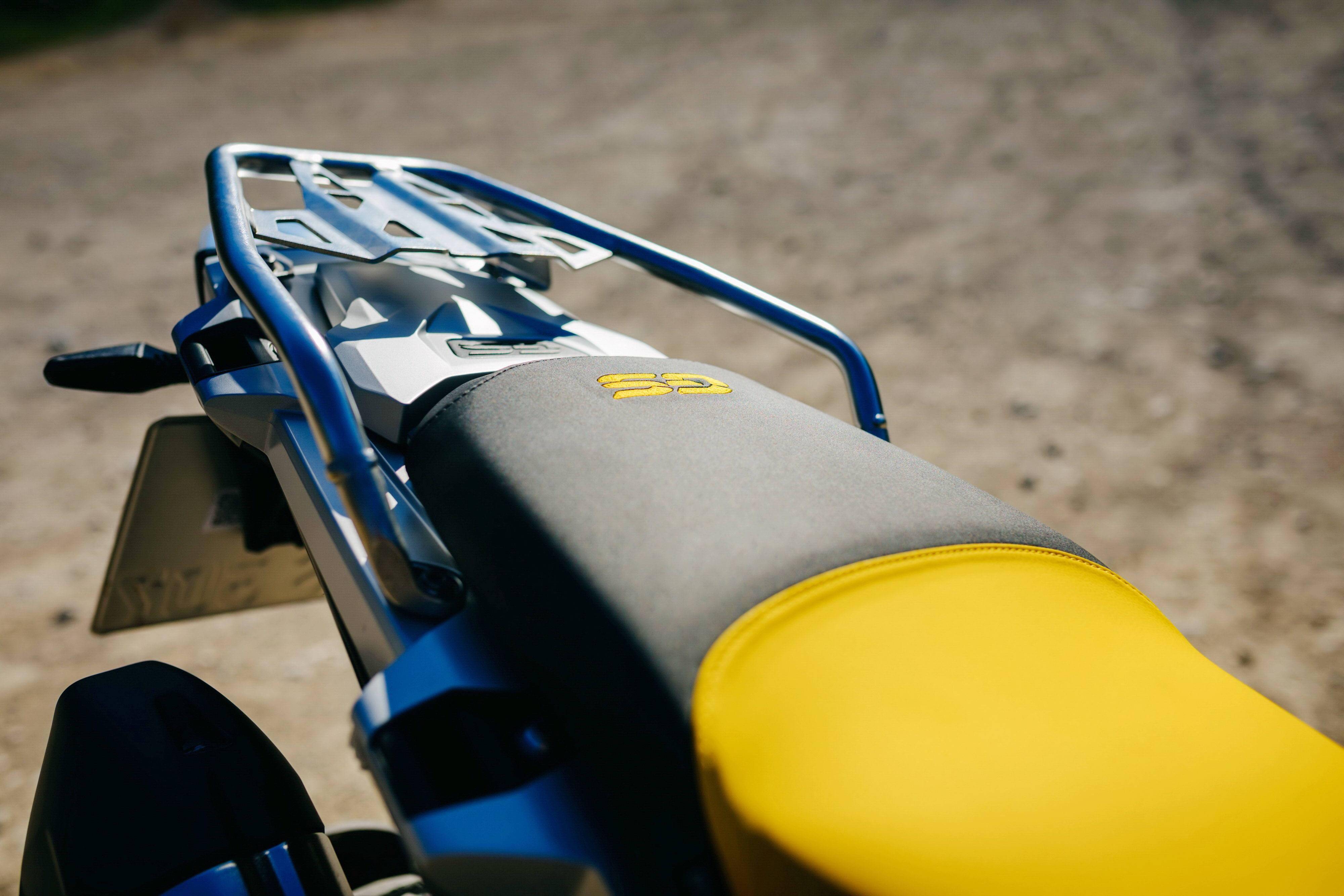 下面的圖片,2021&apos R1250GS GS 四十周年紀(jì)念版的車體特寫(xiě)。使用一塊黃色的小型前風(fēng)檔、采用了與傳奇車型 R100GS 相同風(fēng)格的色調(diào),是這款紀(jì)念版車型的外部特征。