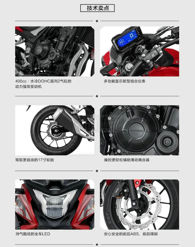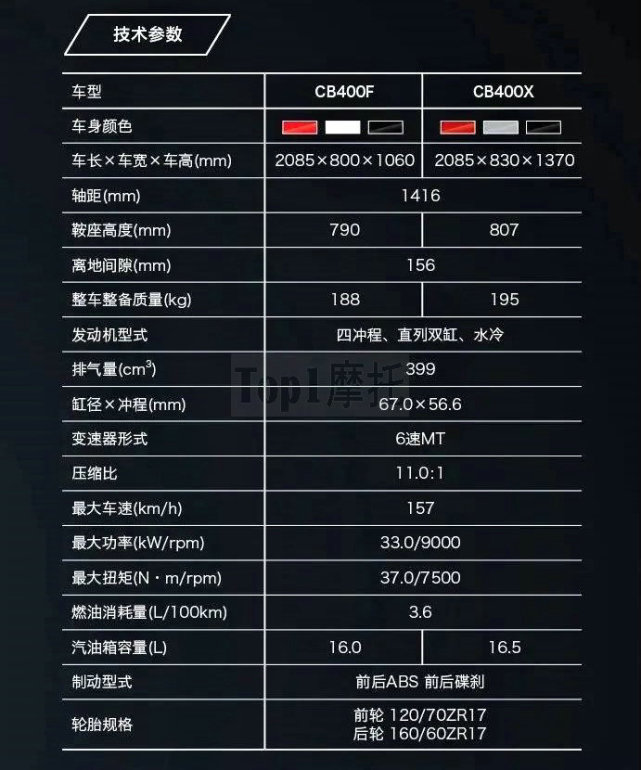 本田CB400X和CB400F本質(zhì)上其實(shí)是一款車,同樣的發(fā)動(dòng)機(jī)、同樣的車架、同樣的配置等等,主要的不同之處其實(shí)是外觀,一個(gè)是街車的樣子、一個(gè)是拉力的樣子。從上圖參數(shù)表當(dāng)中不難發(fā)現(xiàn),這兩臺(tái)車的差異何其小!僅僅只有,座高、車重、油箱容量、車身尺寸略有不同,其他部分一模一樣。