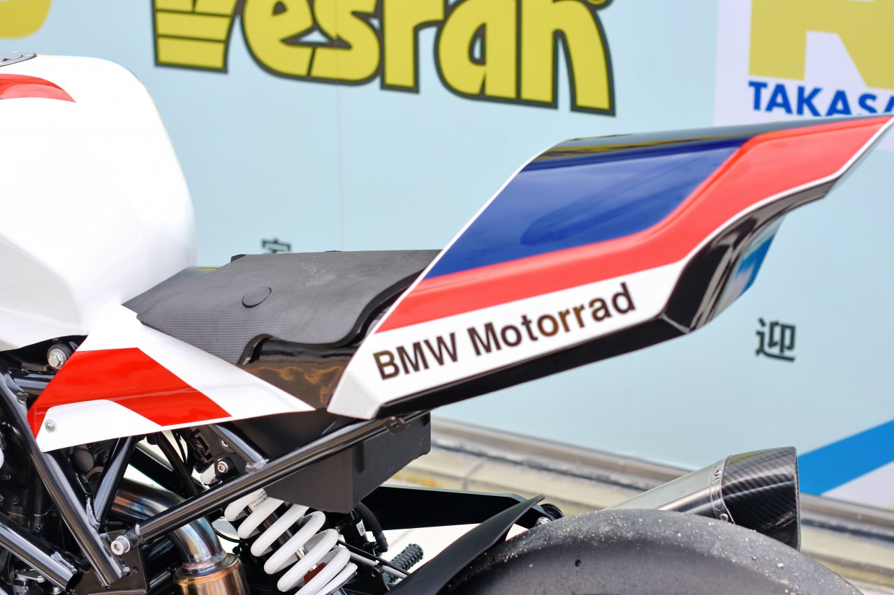現(xiàn)場看到的這臺 “ 跑車版 ” G310 R,最顯眼的改動部分、莫過于有著超級跑車 S1000RR 風(fēng)格的全車外殼,從車頭的整流罩、到短而尖的尾部,再配以白色主調(diào)、紅藍(lán)線條的標(biāo)志性圖案,讓整臺車流露著 WSBK 工廠賽車的影子。從自己的角度去看,眼前的這個模樣,要比印度 TVS 的跑車量產(chǎn)版、有著更多寶馬的印象。