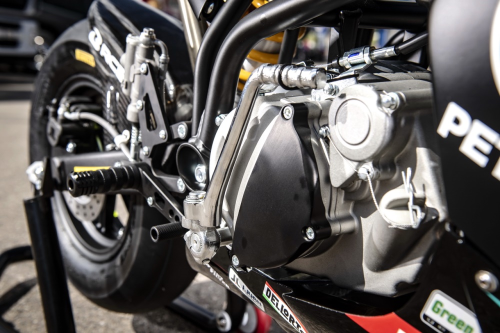 標準狀態(tài)下的 Ohvale GP-0 搭載一副宗申 ZS160 的四沖程風冷單氣缸臥式的發(fā)動機,排汽量 155.5 cc,四檔的變速齒輪箱,標配了滑動式的離合器。該車是今年一月份的時候,F(xiàn)IM 國際摩聯(lián)與西班牙的多納(Dorna Sport S.L,MotoGP 的推廣公司)所宣布增設(shè) FIM MiniGP World Series,F(xiàn)IM 迷你 GP 世界賽系列,指定統(tǒng)一使用的車型。