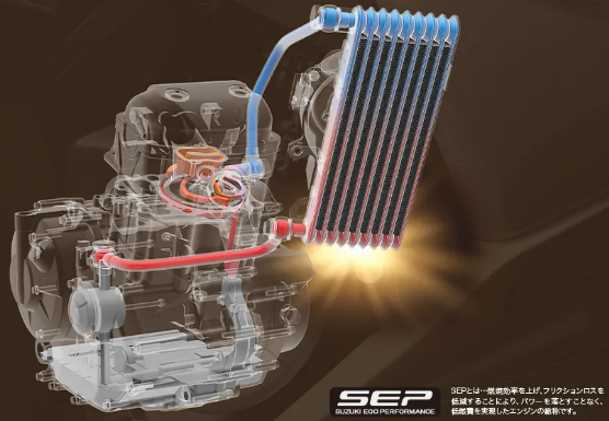 在動(dòng)力方面,兩車均搭載實(shí)際排量249cc油冷單缸發(fā)動(dòng)機(jī),最大功率19.5kw,約26.2匹,最大扭矩22.2N。鈴木開(kāi)發(fā)的這款油冷系統(tǒng)Oil Cooling System,是采取類似水冷水道的走法,但油冷的設(shè)計(jì)零件不像水冷那么多,所以成本相比較要低一些。