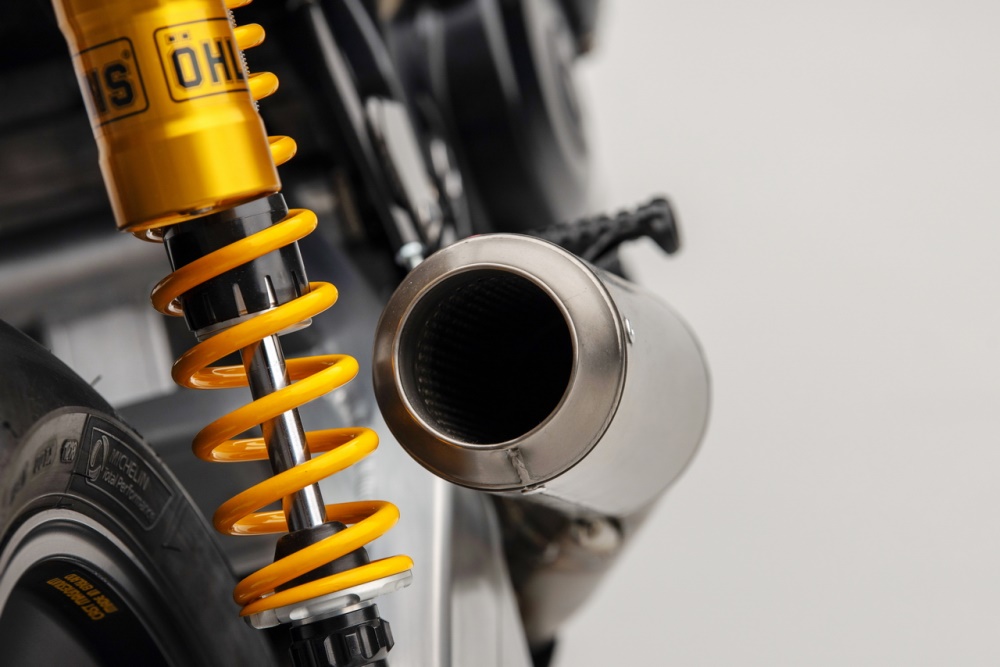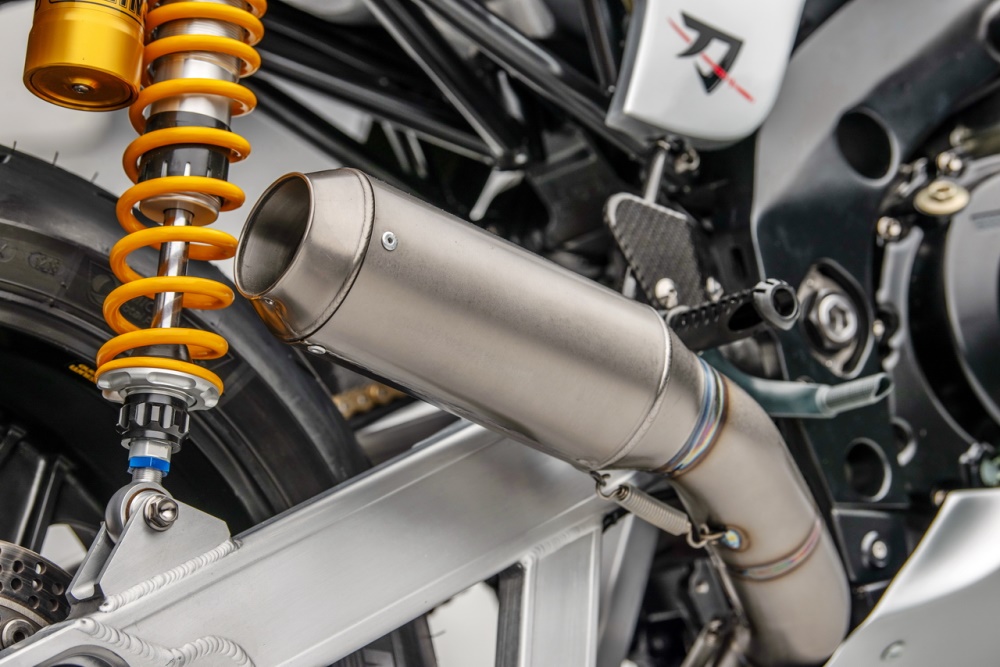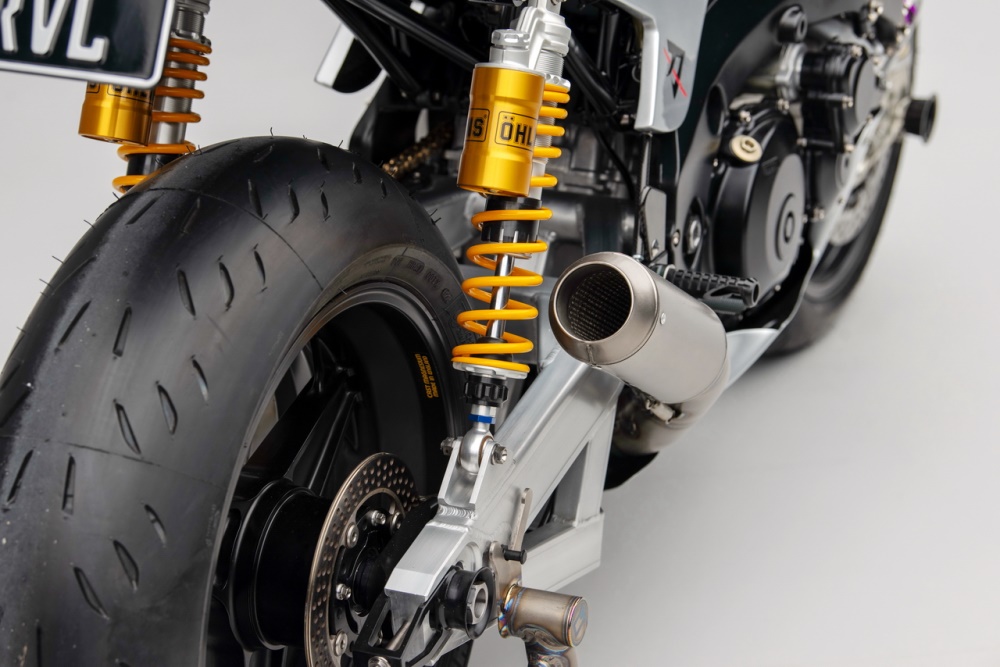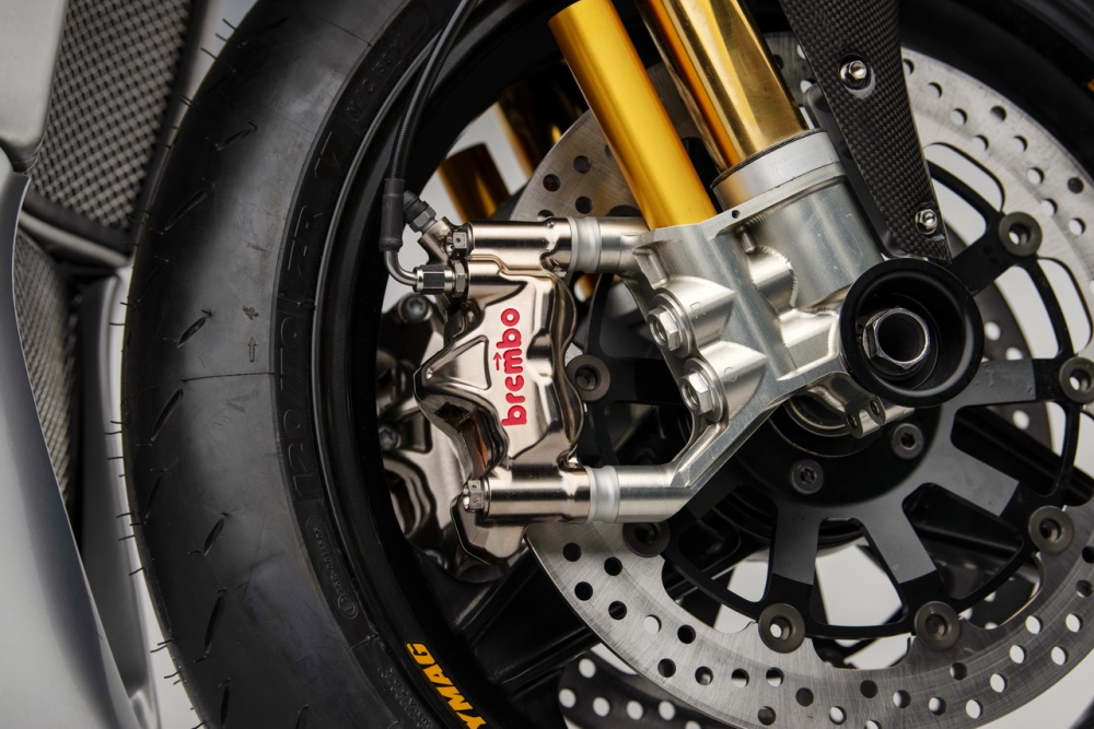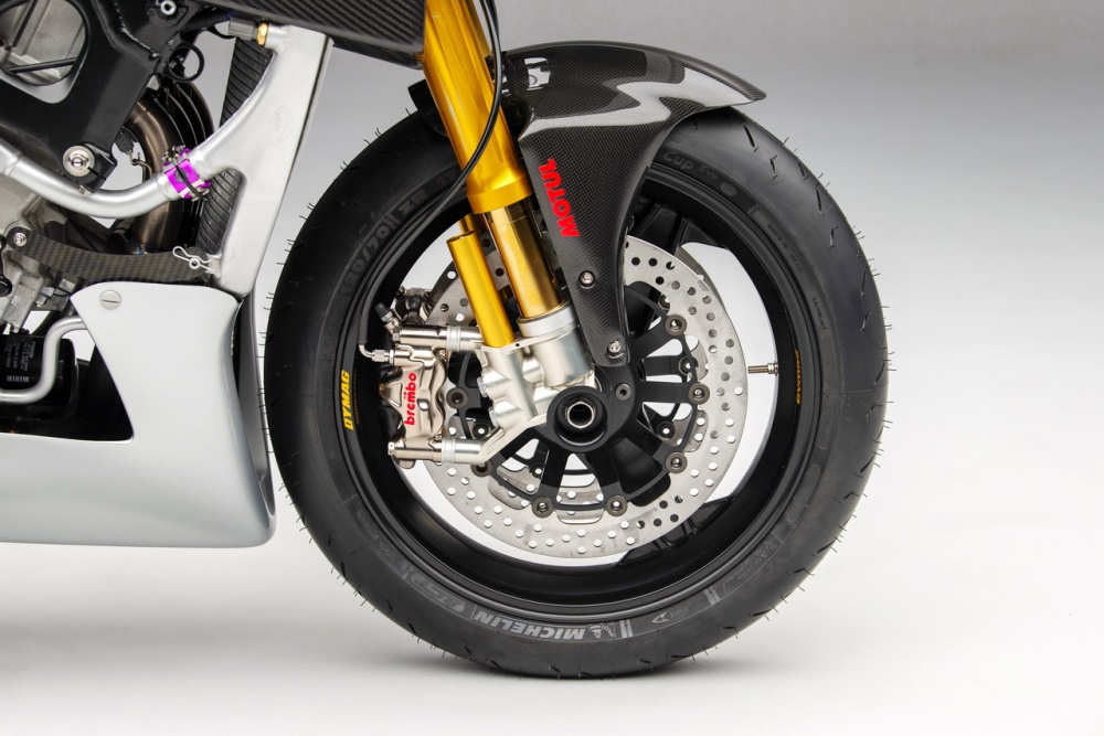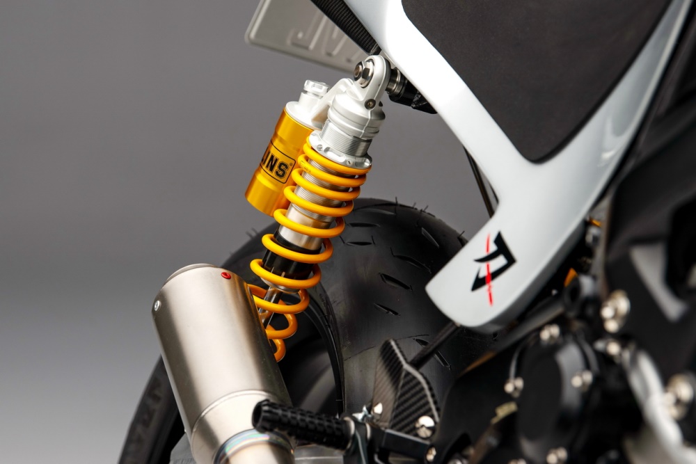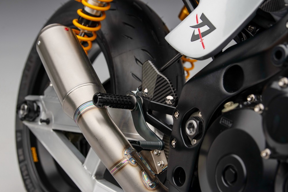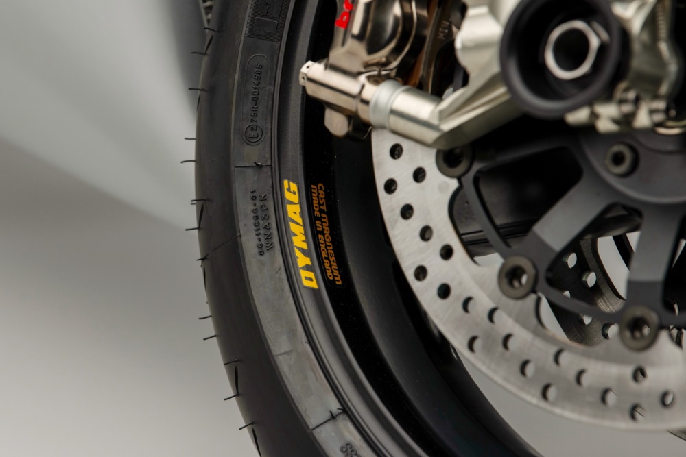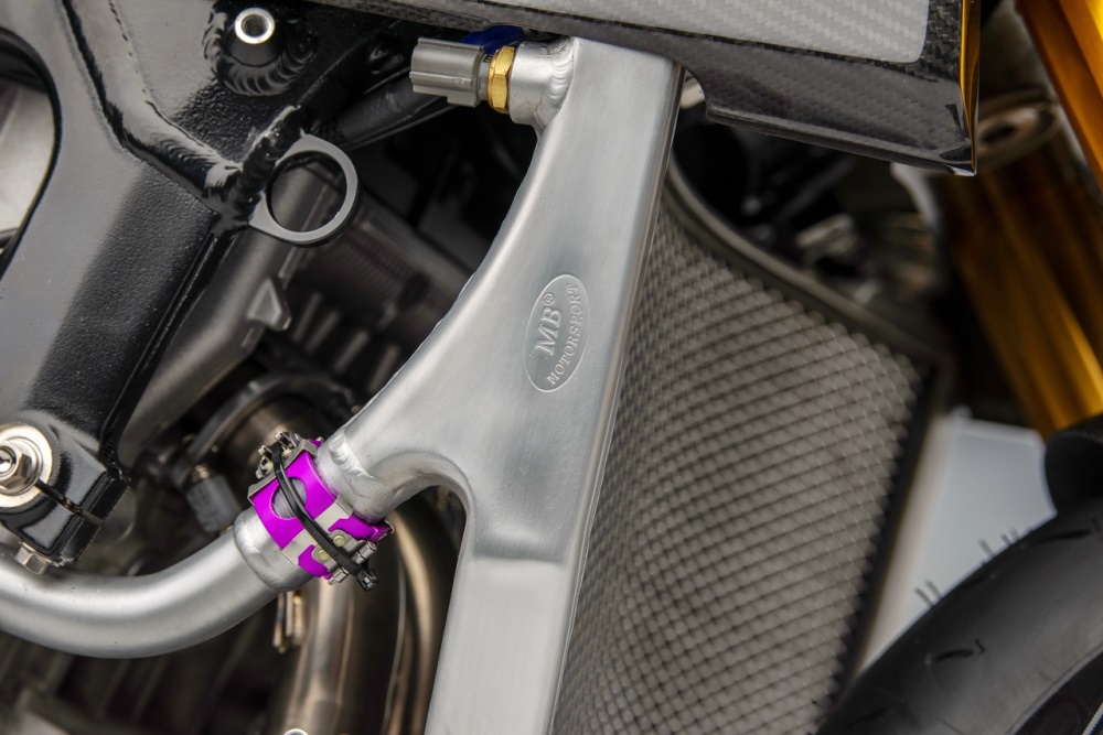 車架的主樑同樣是來(lái)自 GSX-R1000R K8 工廠賽車,鋁合金的后搖臂來(lái)自改裝品牌 Alpha Performance Fabrications,懸掛系統(tǒng)來(lái)自 Ohlins 奧林斯、制動(dòng)系統(tǒng)則是采用了 Brembo 布博,Dymag 的 CH3 前后輪框。
