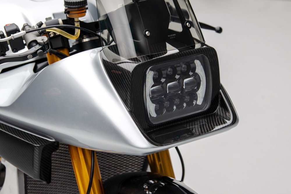 這臺(tái) Katana “ 刀 ” 定制車,有著一個(gè)重要的特點(diǎn):采用了 Suzuki 在 2008 年 WSBK 時(shí)的工廠車隊(duì) Team Suzuki Alstare,所使用的工廠賽車 GSX-R1000R K8 之動(dòng)力單元和車架主樑。
