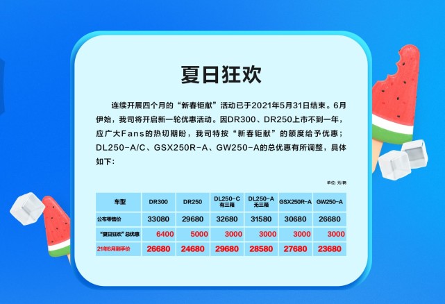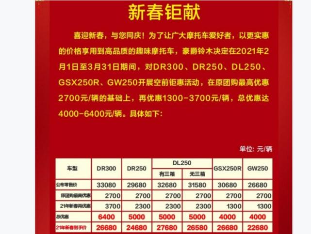 豪爵發(fā)布最新的優(yōu)惠政策,豪爵自家的DR系列優(yōu)惠幅度保持不變,但是豪爵鈴木250全系價(jià)格“上漲”,具體調(diào)整請(qǐng)對(duì)照上下兩圖(上圖最新優(yōu)惠)。