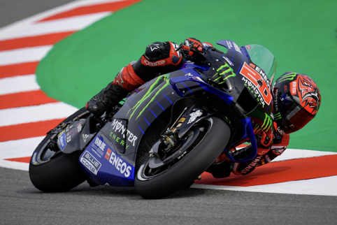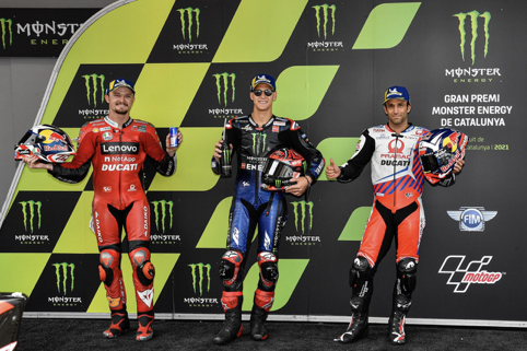 Quartararo(中)早早就做出最速圈拿下竿位起跑,Q2摔車(chē)的Miller(左)還是順利拿下第2位。