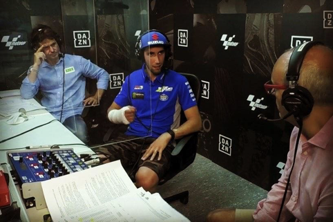 Alex Rins(中)于賽前不慎摔傷右手,無(wú)法參加本站賽事,只能到主播室客串講評(píng)。