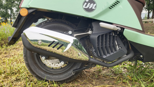 排氣管的鍍鉻防燙罩給檔次感的提升帶來不小的幫助,因?yàn)槭且慌_(tái)水冷發(fā)動(dòng)機(jī),所以能夠看到明顯的散熱格柵。