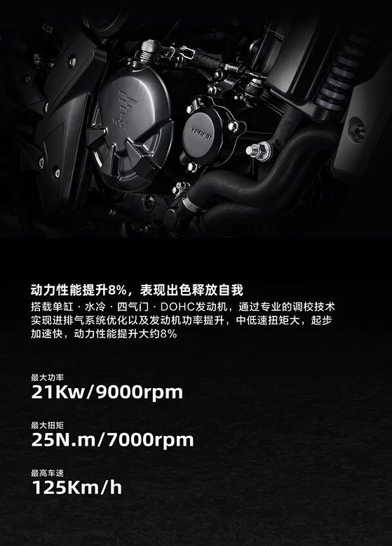 發(fā)動機(jī)還是那臺292cc排量的單缸水冷發(fā)動機(jī),最大功率21kw/9000rpm,最大扭矩25Nm/7000rpm,而之前的老款是19.3Kw/24.5Nm,經(jīng)過重新調(diào)教更加擅長中低扭矩的輸出。