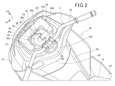 而第三種設(shè)計的氣囊路徑更加直觀,便是直接安裝于手把上方。但是若瞬間充氣的填充單元也同樣如此靠近騎士,將可能反導(dǎo)致其他危險,因此該專利的解決方案便是將充氣裝置安裝于手把下方的三角臺上部,利用軟管連接手把上方的氣囊,達(dá)到遠(yuǎn)程填充的效果。