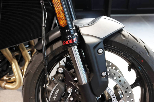41mm Showa倒立前叉不具備調(diào)節(jié)功能,前剎車是310mm雙碟,配Nissin雙活塞剎車卡鉗,另有ABS防抱死系統(tǒng)。