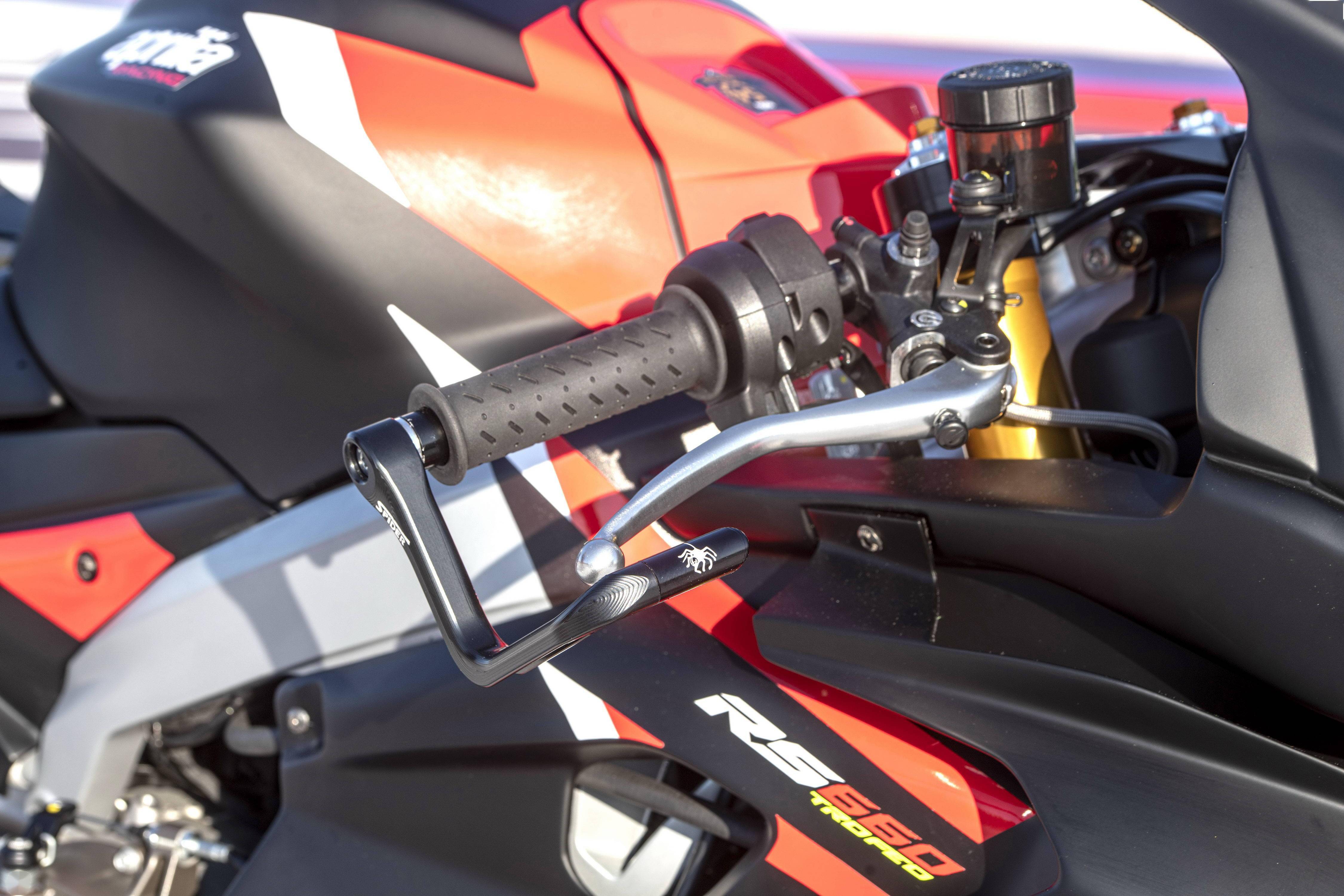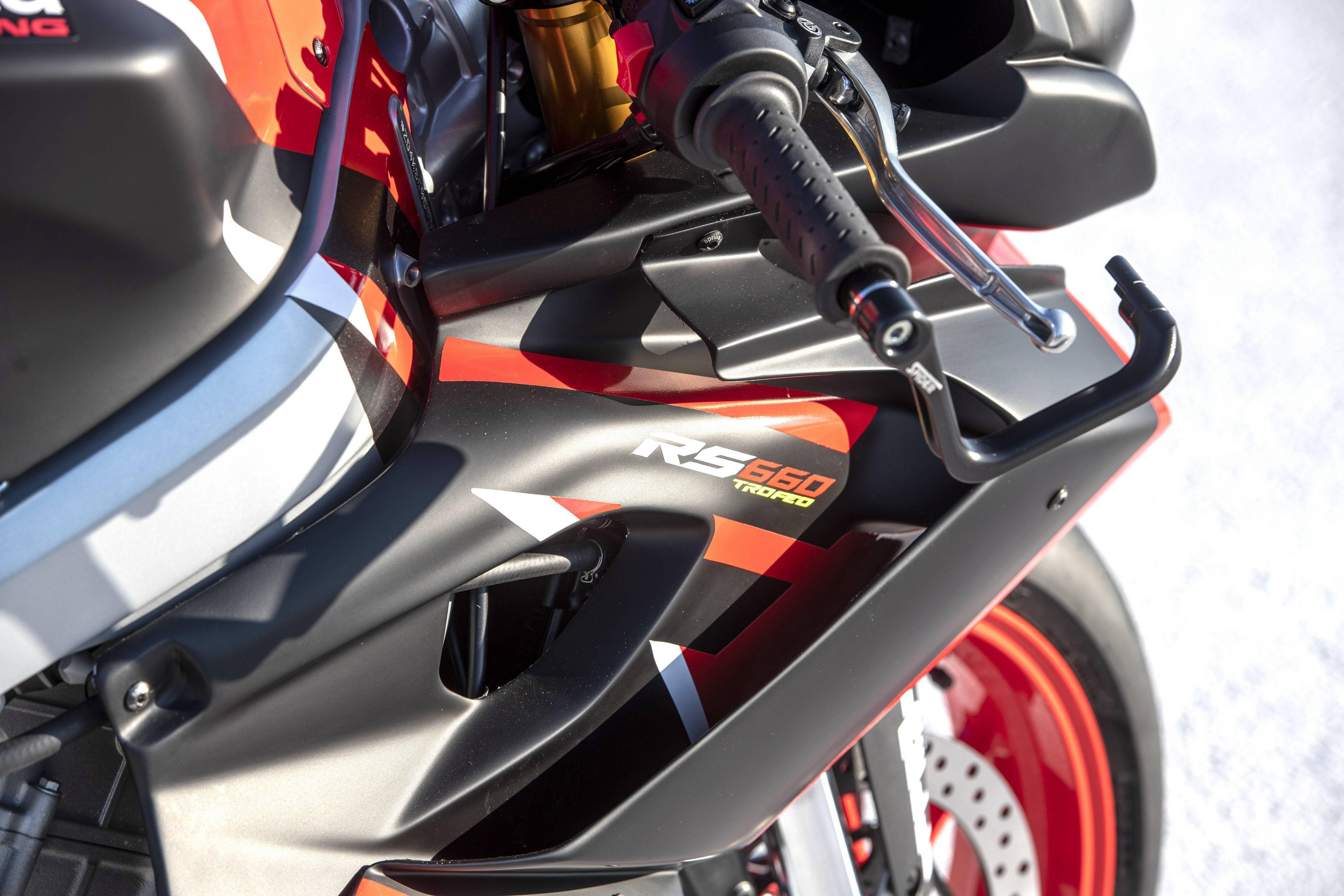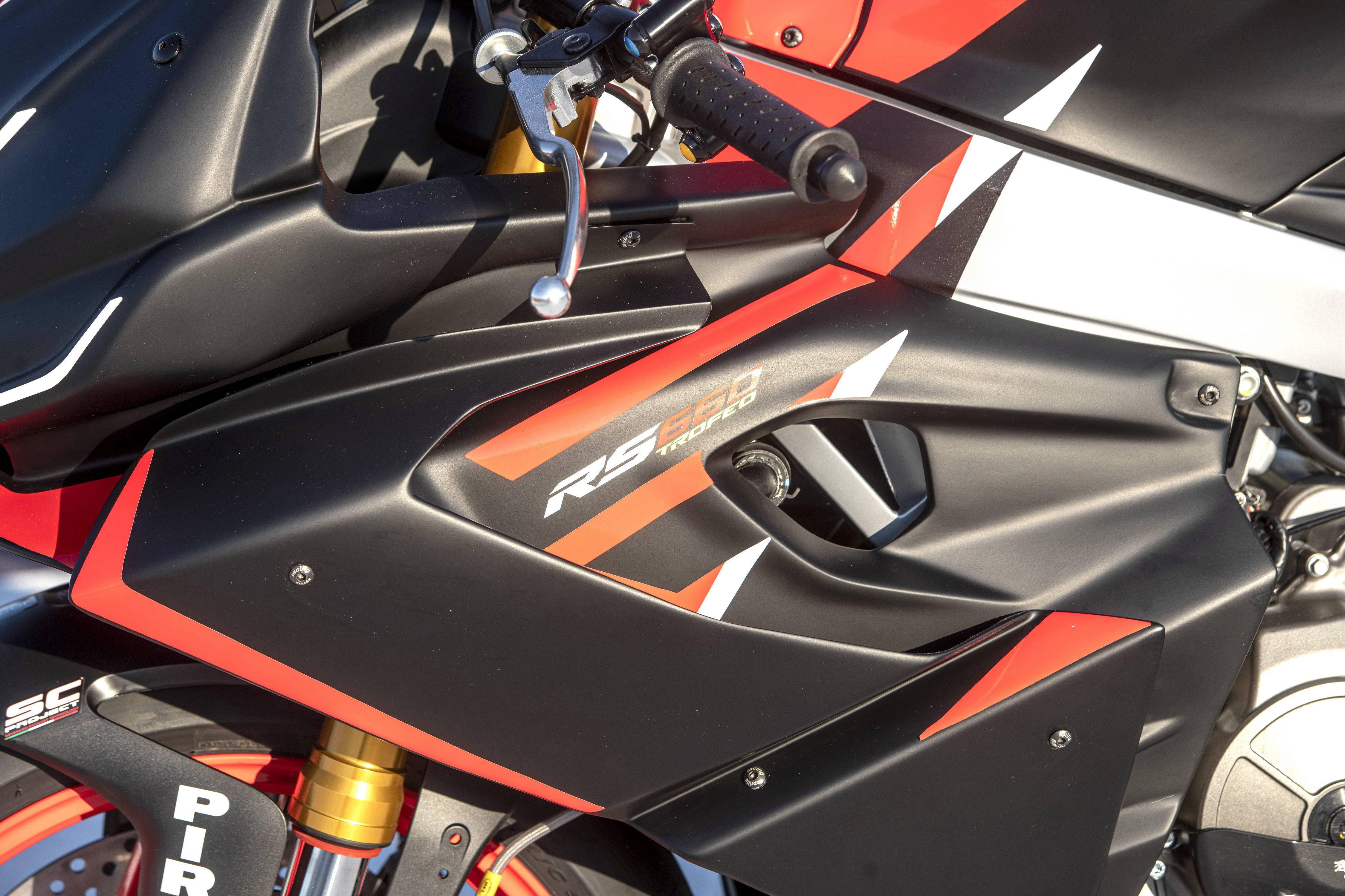 經(jīng)過改裝之后的 RS660 Trofeo,換裝了 Ohlins 奧林斯的后減震,SC-Project 的排汽系統(tǒng),標(biāo)準(zhǔn)款所使用的 KYB 倒立式前叉、內(nèi)部換裝了來自 Andreani 的升級(jí)套件;整流罩換裝了由 Cruciata Racing 所生產(chǎn)的玻纖制品;車體圖案的噴油工作由 Carrozzeria Zanasi 完成,該公司同時(shí)也負(fù)責(zé)為阿普利亞 MotoGP 工廠車隊(duì)所使用之 RS-GP、做車體圖案的噴油工作;人體工程學(xué)經(jīng)過了調(diào)整,采用了較低的分離式車把、并換裝了升高的腳踏,以對(duì)應(yīng)賽道上的使用。此外,升級(jí)的部分還包括了倍耐力的 Supercorsa V3 SC1 輪胎,Brembo 布博的賽車級(jí)剎車片,賽車用的空氣濾清器濾芯,賽車按鈕等。
