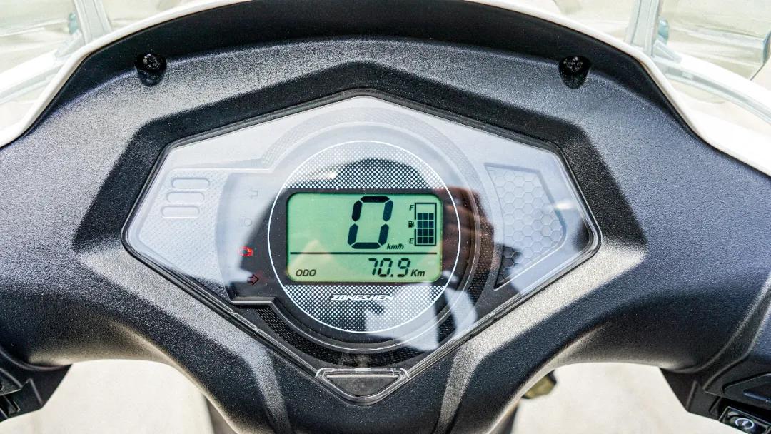 125ET使用了一塊液晶儀表,能顯示時(shí)速,油表,總里程以及小計(jì)里程,即使在強(qiáng)烈的太陽光下也能清晰看到數(shù)據(jù),遺憾的是沒有時(shí)間顯示功能,儀表邊上輔以各種知識(shí)燈。另外,在夜間啟動(dòng)車輛時(shí),儀表會(huì)有七彩跑馬燈的自檢效果,還蠻炫酷的。