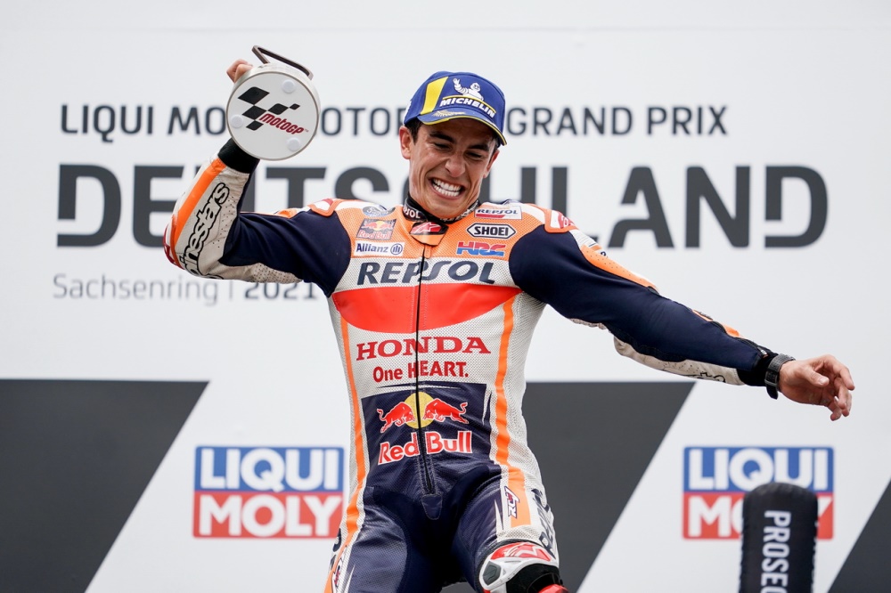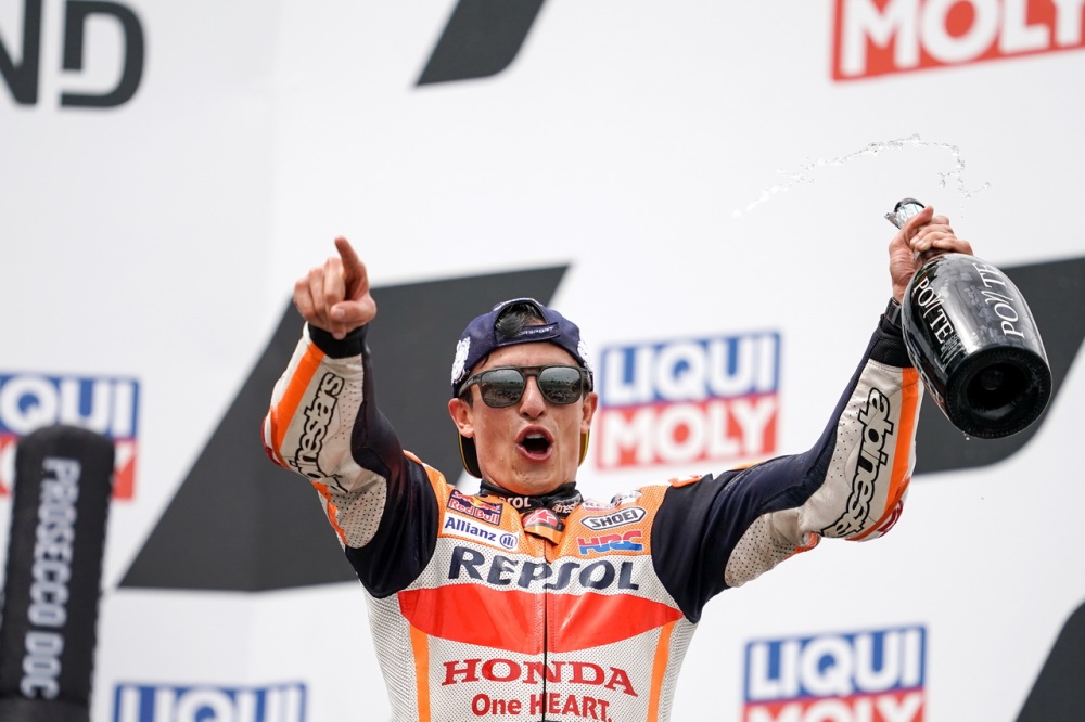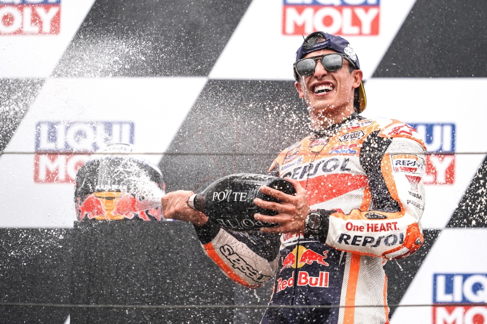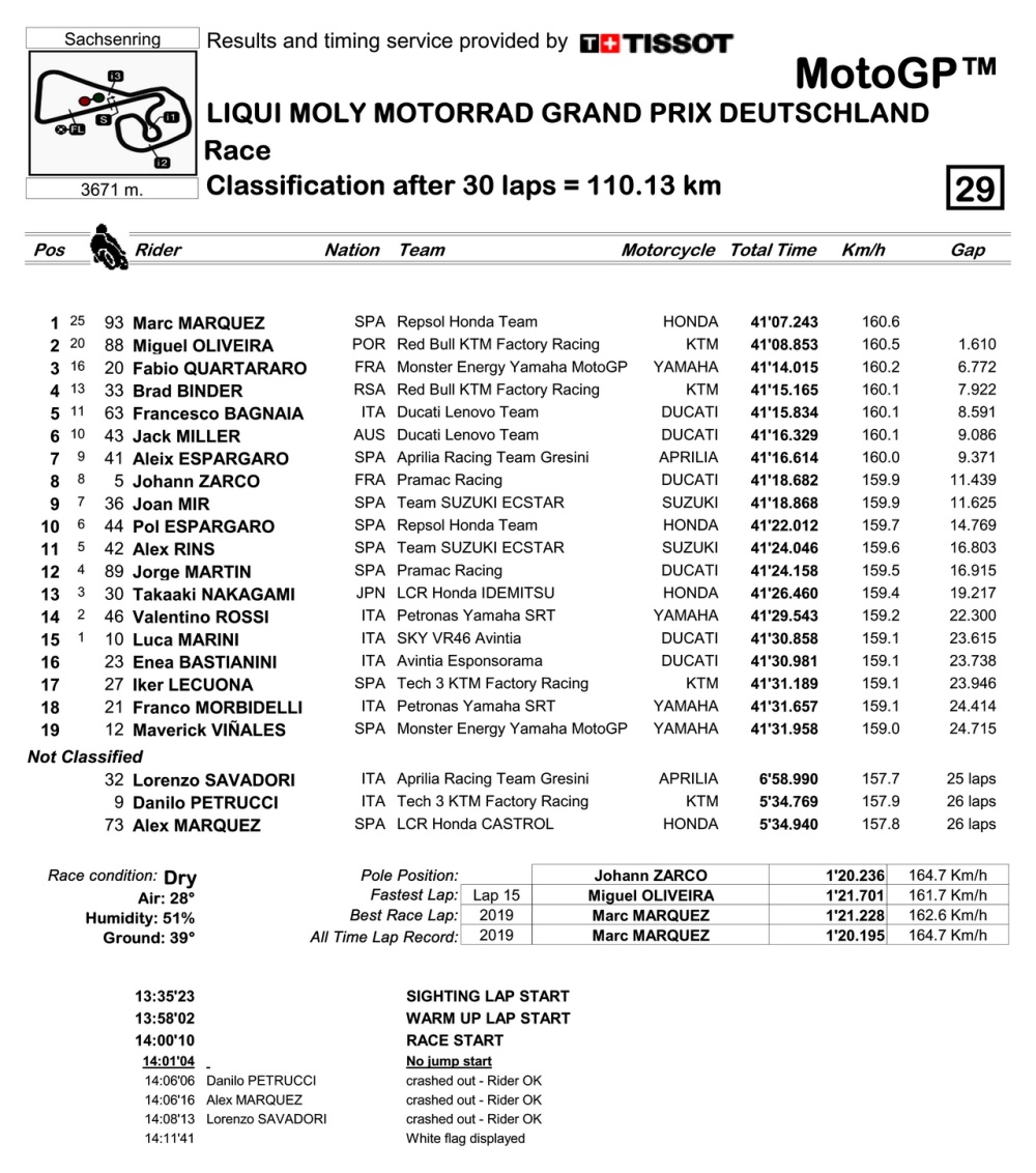 倒數(shù)第 2 圈的時(shí)候,在對(duì)手一輪的狂推都無(wú)法接近之下,跑著自己節(jié)奏的馬昆斯把原本只有大約 1 秒的優(yōu)勢(shì)、擴(kuò)大至接近 1.9 秒。最終他順利奪得了德國(guó)站的勝利,連續(xù)十一年、在薩森靈賽道上稱王。這是他復(fù)出之后的首個(gè)冠軍,與上一次的分站冠軍、已經(jīng)相隔了 581 天(他對(duì)上一次的分站冠軍,是 2019 年十一月 17 日的西班牙瓦倫西亞站)。