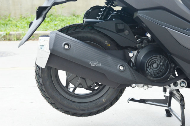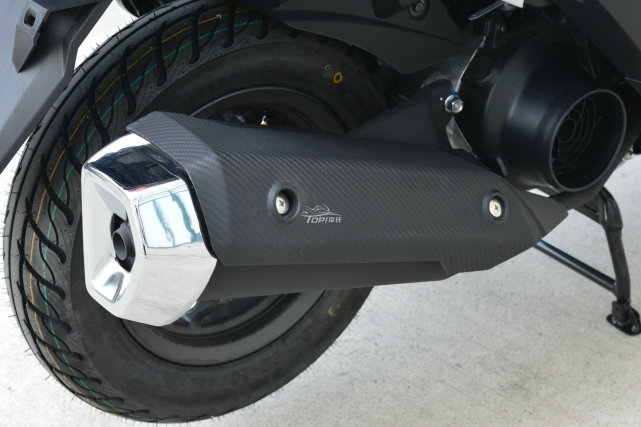 排氣管的防燙罩是仿碳纖維紋理的涂裝,看上去確實挺有檔次感。