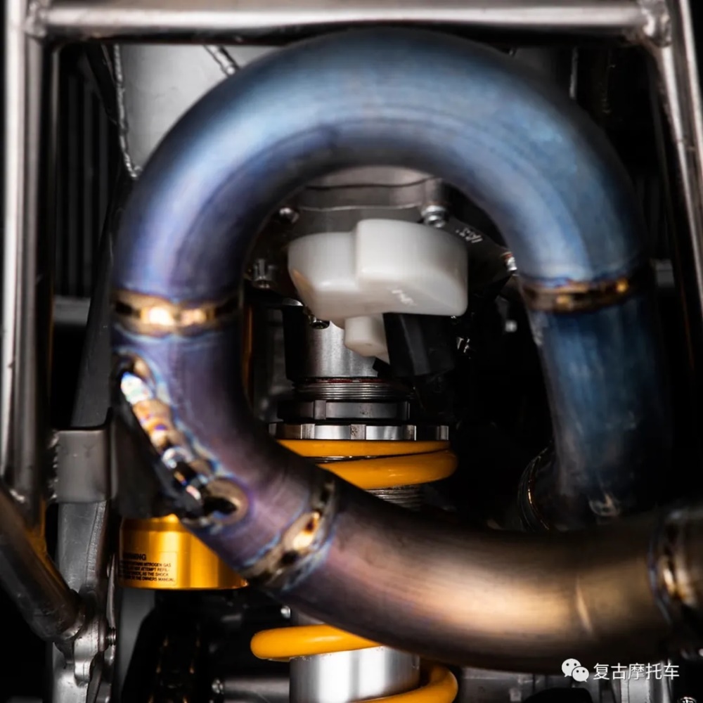 在這部車上,Jérôme和Yvan設計并建造了一個新的鋁制管狀框架,用以承載油箱和空氣濾清器,在這些零件上還使用了可以快速釋放的緊固件,讓所有東西都可以輕松拆卸,重新制作的油箱也比原廠的7.9升油箱大一些。