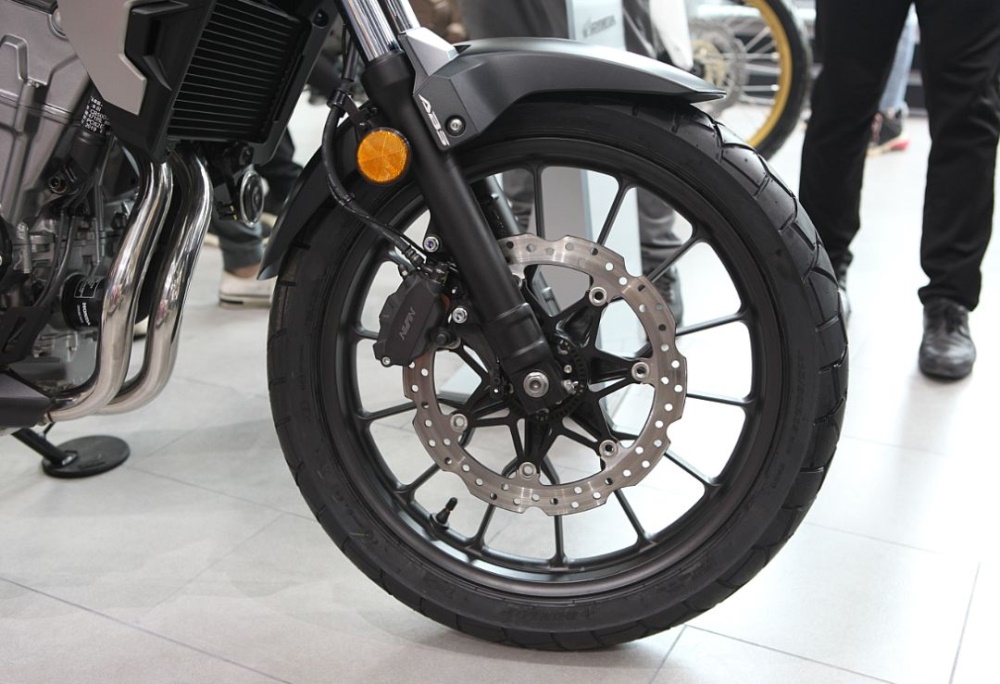 CB500X的輪胎選用了鄧祿普MIXTOUR多功能胎,前輪尺寸110/80 R19,后輪尺寸160/60 R17。CB400X則配置了正新的MIGRA S1半熱熔公路胎,前輪尺寸為更寬的120/70 R17,后輪尺寸160/60 R17。輪胎的選擇也能夠看出兩車在定位上的不同,CB500X有著19寸前輪和更高的離地間隙,搭配全地形輪胎可以應(yīng)付更多的路況。CB400X配備的半熱熔公路胎則是更多的顧及了鋪裝路面的抓地力和運(yùn)動(dòng)性,定位更偏向公路旅行。兩車在制動(dòng)方面采用基本相同的配置,都是NISSIN前單向雙活塞卡鉗與后單向單活塞卡鉗的組合,標(biāo)配ABS。