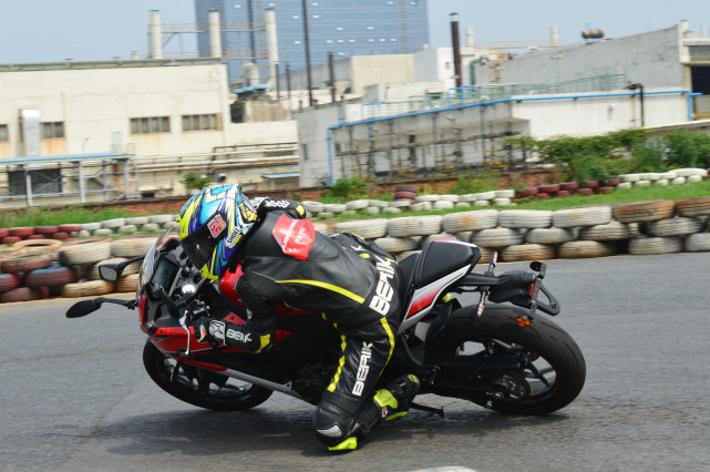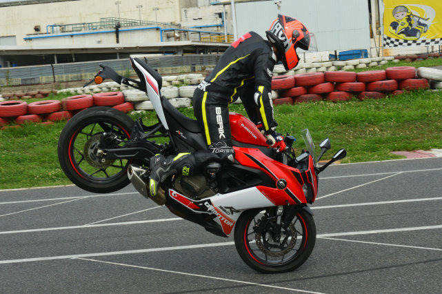 專業(yè)的特技車手在封閉的賽道里面,向我們展示了賽350的性能,燒胎、翹頭、翹尾,壓彎磨膝輕松不在話下。