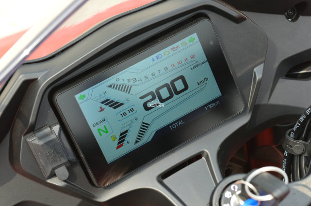 全彩TFT液晶儀表尺寸大小和追350保持一致,但是賽350的儀表具備藍(lán)牙連接和手機(jī)投屏功能,正式告別手機(jī)支架的束縛。