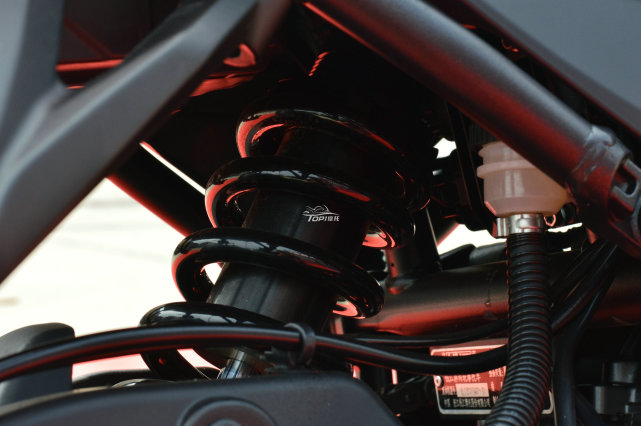 倒立式前叉不可調(diào)節(jié),單碟版本前剎車規(guī)格為:300mm單盤+單向雙活塞浮動(dòng)卡鉗;雙碟版本前剎車規(guī)格為:260mm雙盤+對(duì)向四活塞固定卡鉗。