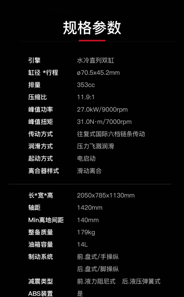 賽350是國(guó)產(chǎn)摩托車當(dāng)中,真正意義上的一款小排量雙缸跑車,它的誕生讓國(guó)產(chǎn)雙缸跑車挺直了腰桿,一個(gè)能和鈴木GSX250R正面硬剛的純國(guó)產(chǎn)車型誕生,(上圖為雙碟版本,下圖為單碟版本)。