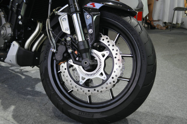 倒立式前叉由KYB提供,并且具備調(diào)節(jié)功能,前剎車為雙盤的形式,由西互提供剎車卡鉗,并且標(biāo)配前后ABS。