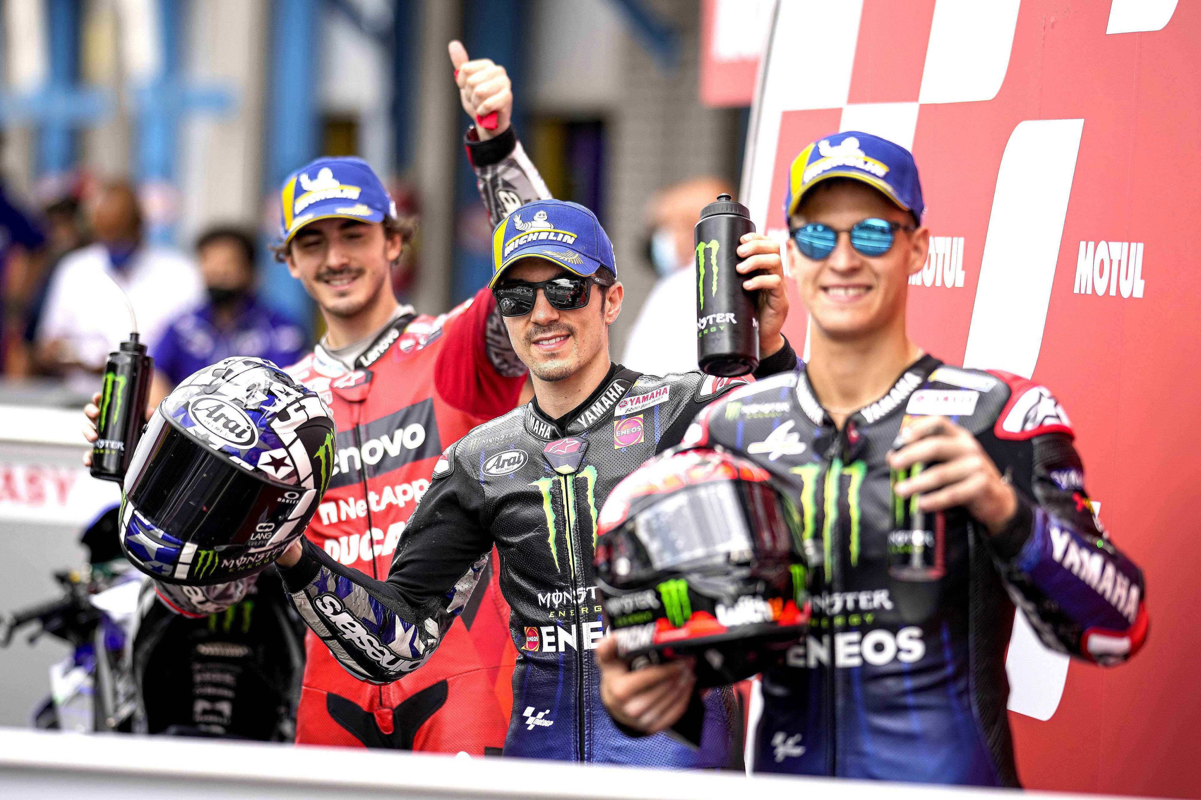 MotoGP 級別,賽前的 Q2 排位賽,Yamaha MotoGP 工廠車隊占據(jù)了發(fā)車的前兩位:12 號車的維尼艾利(Maverick Vinales)跑出了破記錄的 1 分 31.814 秒圈速、奪得了排頭位出賽,20 號車的夸塔拉羅(Fabio Quartararo)慢了 0.071 秒排在第二。63 號車的巴納亞(Francesco Bagnaia)排在了第三。