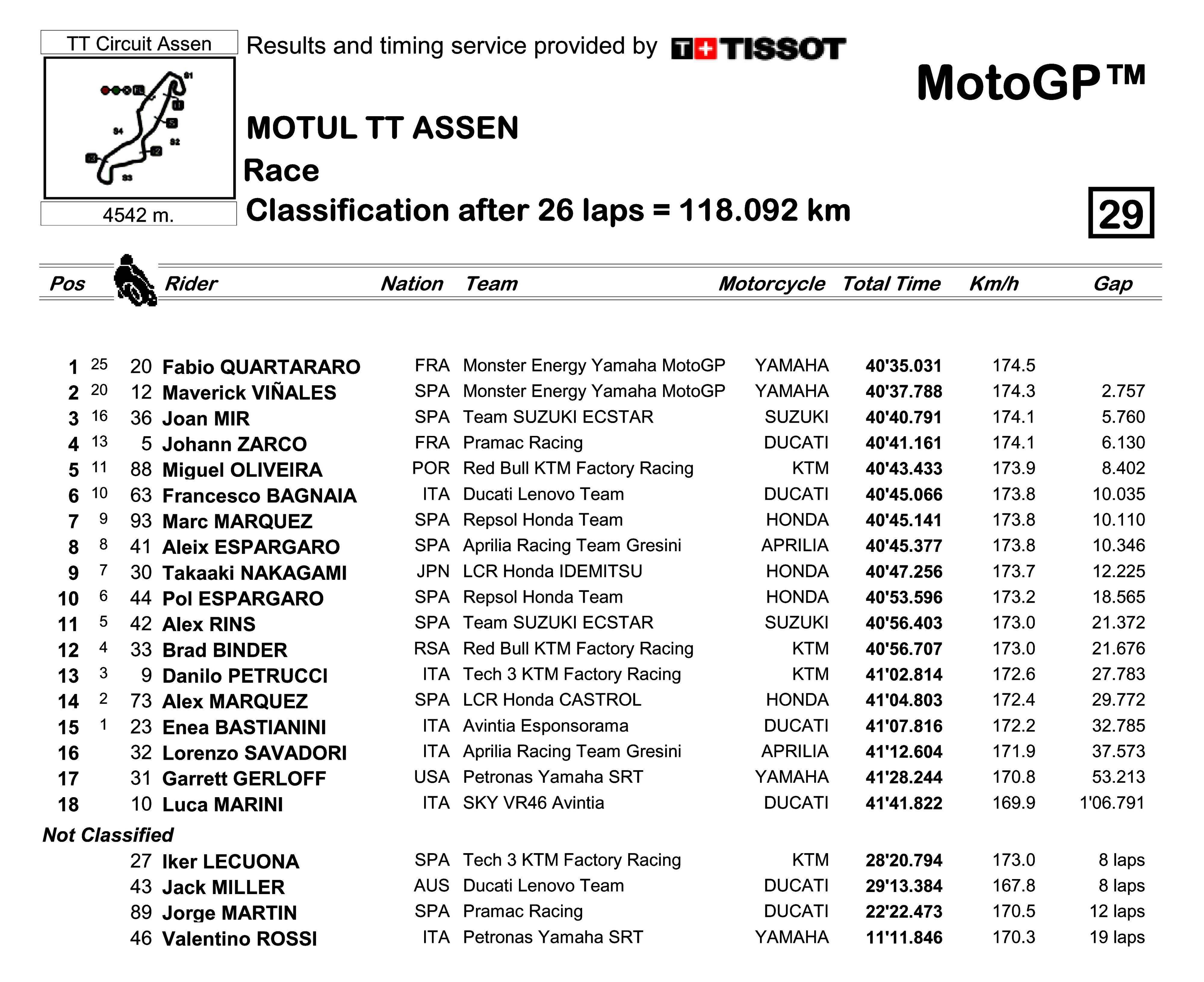 最終,夸塔拉羅輕松奪得了荷蘭站的勝利,本賽季第四次奪得冠軍。維尼艾利拿到了第二,2021 賽季第二次登上頒獎臺。36 號車的米爾(Joan Mir)奪得了第三。