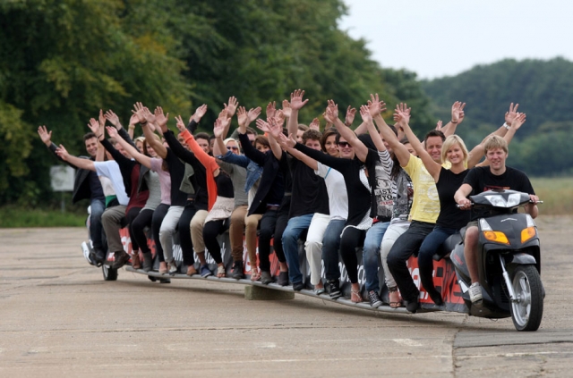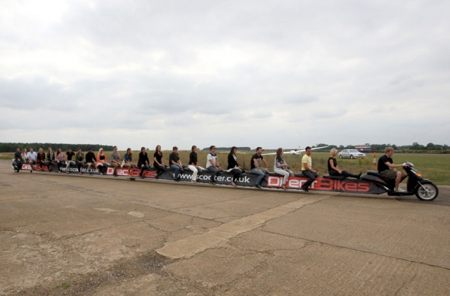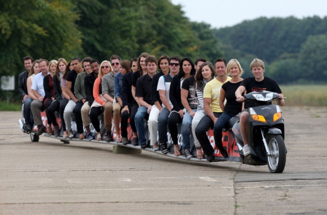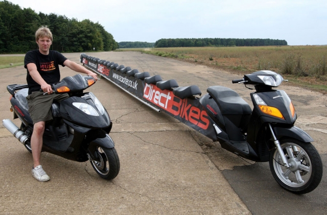1985年,日本本田公司的18名雇員聯(lián)合設(shè)計(jì)制造了一輛特長摩托車,長達(dá)6.4米,可同時(shí)乘坐20人,是世界上最長最大的摩托車。 31歲的英國人科林Furze制造了一個(gè)22米長的摩托車,可乘坐25人,時(shí)速可達(dá)56公里/小時(shí)。