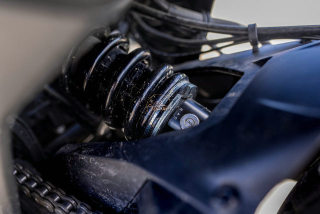 后減震同樣是由KYB提供,中置減震用了多連桿結(jié)構(gòu)的單筒油壓形式,具備預(yù)載調(diào)節(jié)和回彈阻尼調(diào)節(jié)功能。