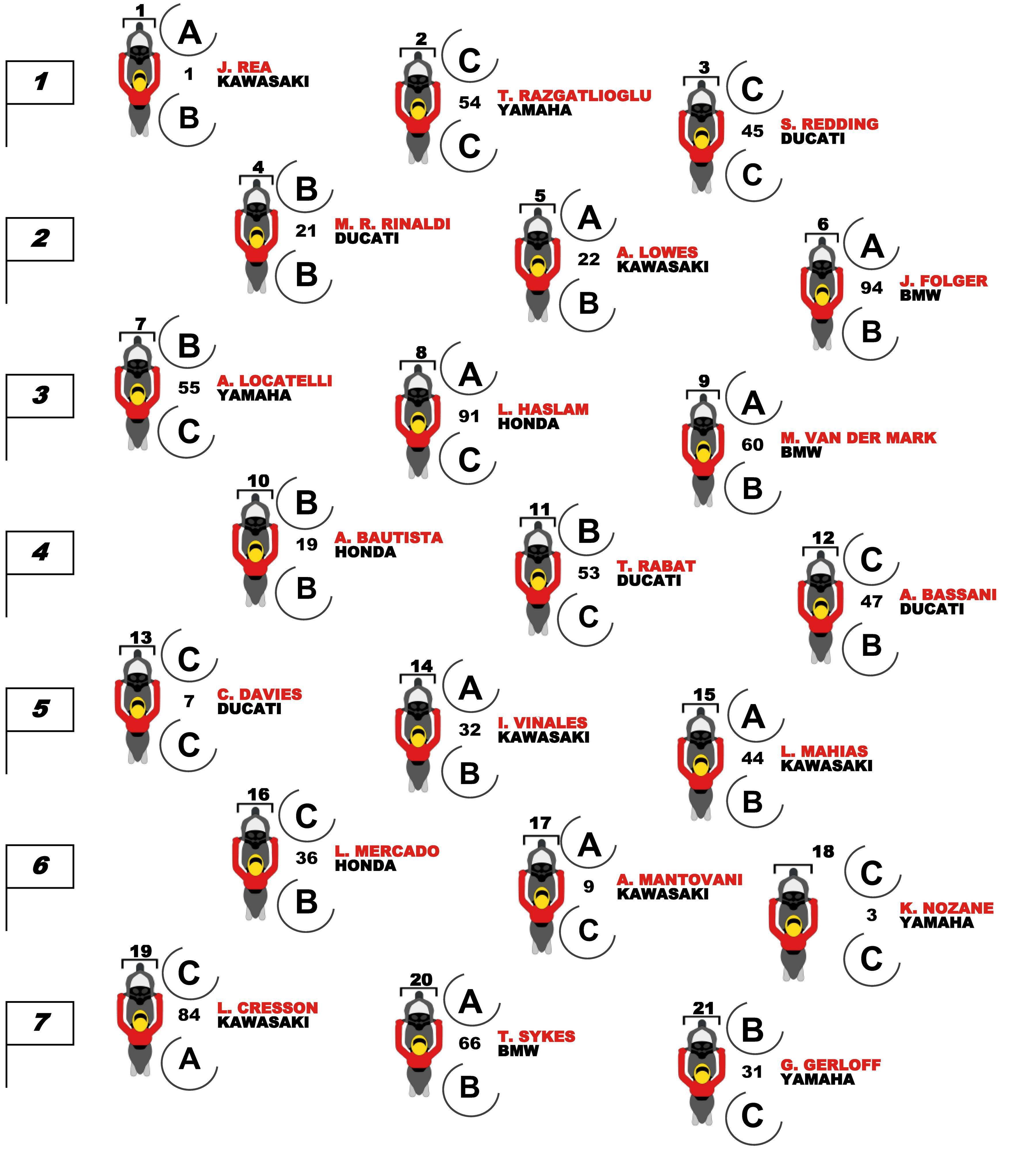 WSB 級別,正賽前的 Superpole 超級排位,應(yīng)屆世界冠軍、駕駛 1 號車的雷亞(Jonathan Rea)以 1 分 33.842 秒的最佳圈速奪得了第一。后面,土耳其車手拉格里奧盧(Toprak Razgatlioglu)、英國車手雷?。⊿cott Redding)分別排在了第二、第三。